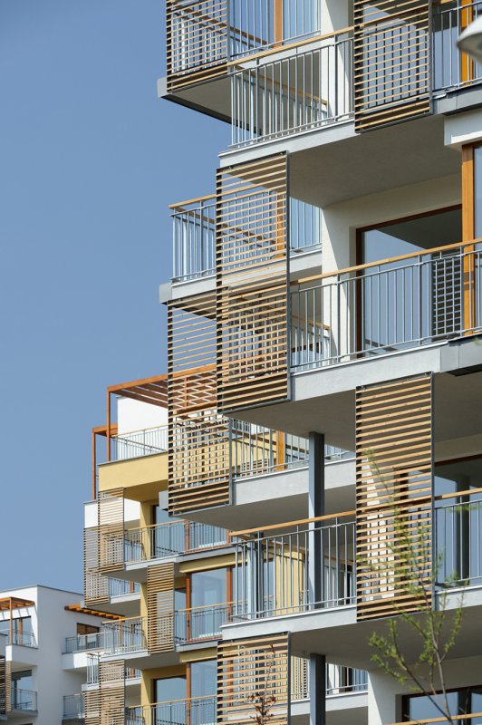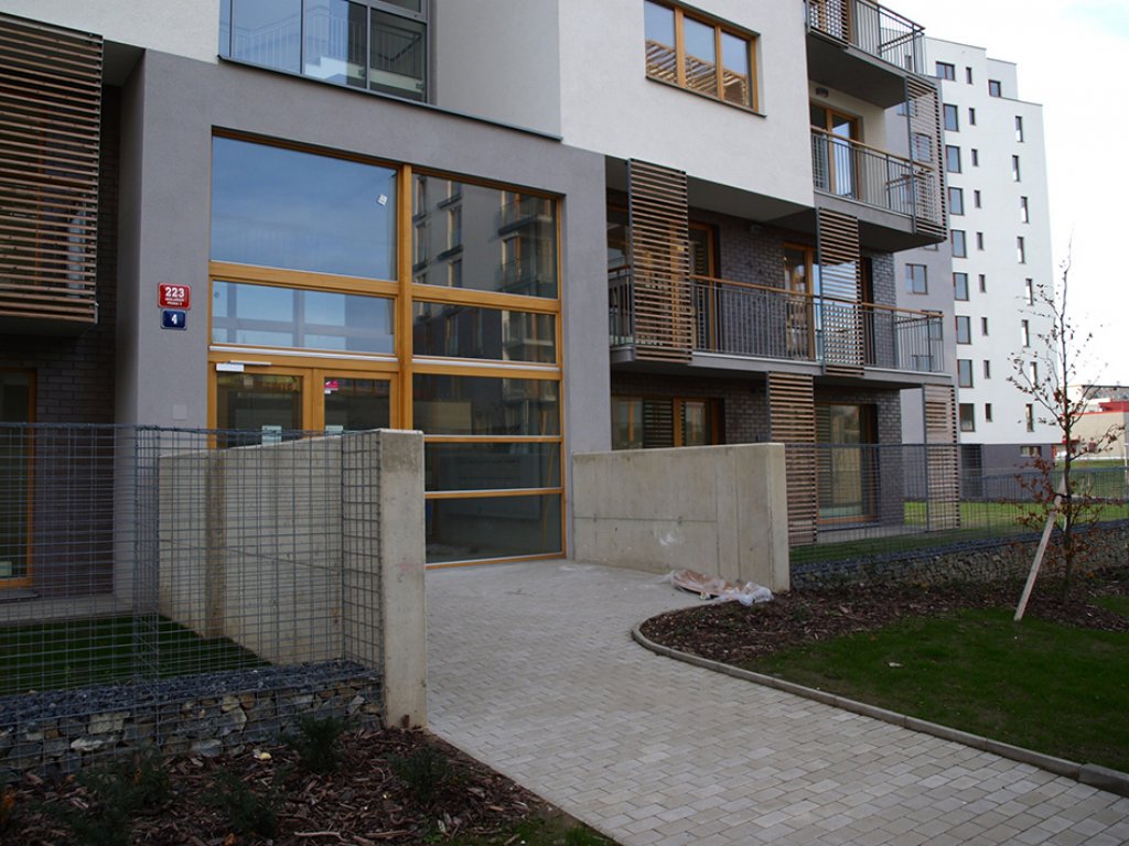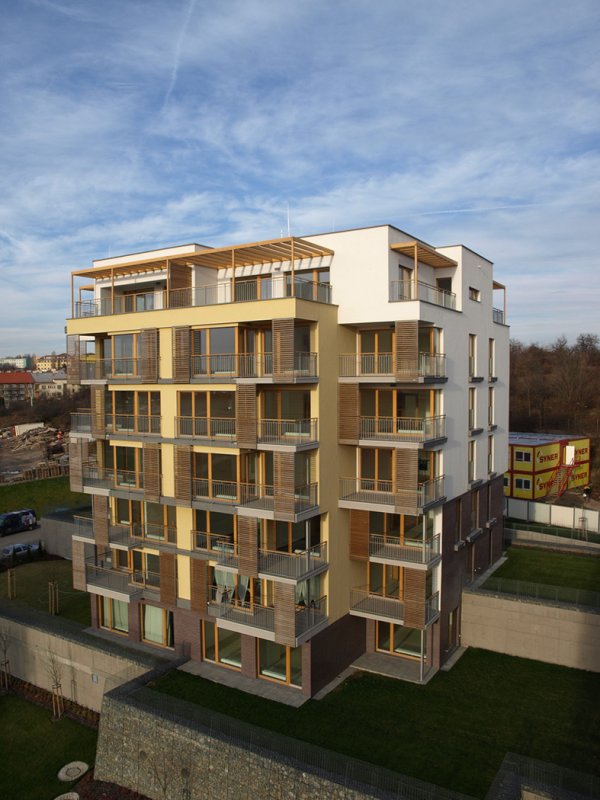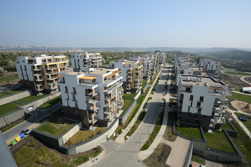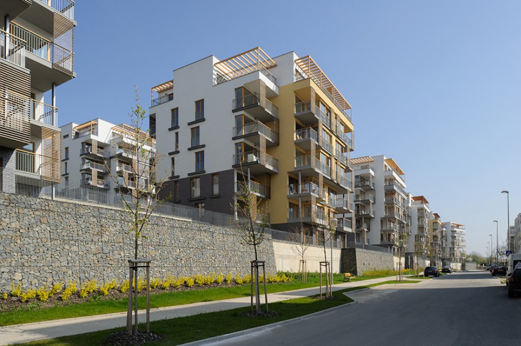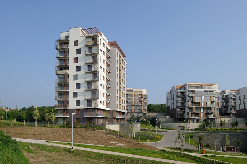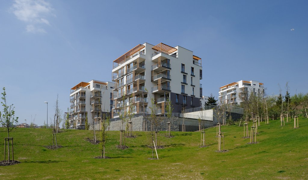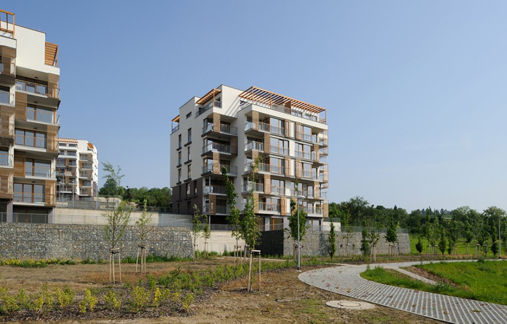 Charakteristické pro lokalitu je, že okolí objektů je řešeno terasově, s terasami na rostlém terénu i nad střechami garáží, a tyto terasy budou sloužit pro obyvatele bytů jako privátní okrasné zahrady bez pohledového kontaktu s veřejnými uličními prostory, pro tichý a klidný život okolo domu. Bodový systém objektů umožní vsazení objektů do zeleně a prorůstání zeleně ze středové plochy koncipované jako přírodní zeleň vzhůru do svahů k okraji zástavby, kde se prolne se zelení okrajovou.