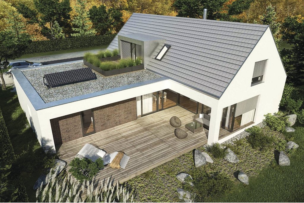 Projekt prvního vzorového domu e4 autora Ing. arch. Bohumila Brůži vyhrál v architektonické soutěži firmy Wienerberger, jejíž hlavním zadáním je výstavba domů s téměř nulovou spotřebou energie. První realizovaný dům podle principů e4 má celokeramickou obálku z cihel Porotherm, pálenou střešní krytinu Tondach a pohledové zdivo Terca.