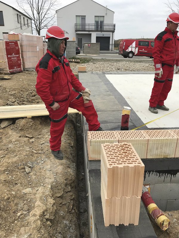 12. duben 2019 byl nezvykle chladný a větrný, člověk by řekl, že je leden. Za účasti novinářů byla na základové desce (zhotovené vč. kanalizační infrastruktury) zahájena výstavba prvního šáru nosných obvodových zdí domu. Speciálně pod budoucí vytápěnou částí domu byl použit cihelný blok Porotherm 38 TS Profi (impregnovaný cihelný broušený blok s minerální izolací pro sokl tl. 38 cm na zakládací maltu).