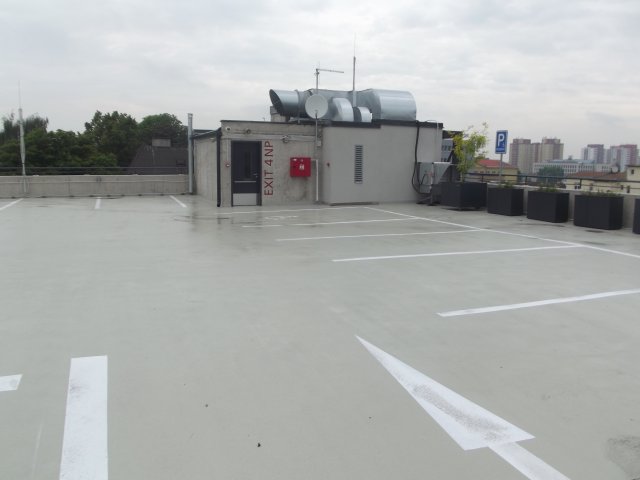 Montovaný železobetonový skelet má nekrytou plochou střechu určenou též pro parkování automobilů. Z pohledu ze země se jeví jako zelená, ale to jen klamou viditelné truhlíky a květináče, rozestavěné po obvodu atiky. I když je za dveřmi léto, nabízí se otázka, jestli si obsluha parkovacího domu poradí v zimě s nečekaným přívalem sněhu. I když poslední vrstva střechy je zdrsnělá, musíme věřit, že vozidla se při šikmém vjezdu a sjezdu nezmění, ergo kladívko, v sáně. Vstup do objektu bude zajištěn po načtení parkovacího lístku.