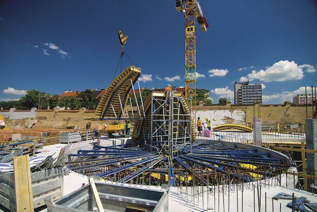 Při betonážích bylo využito oboustranného bednění s tím, že se jednalo o stejné sady bednění. Ty se po odbednění předchozího taktu pouze na místě upravily na menší průměr a větší sklon prstence. „Odbednění však bylo možné, až když beton předchozího taktu dosáhl modulu pružnosti 26 GPa tj. 80 % požadovaného modulu pružnosti po 28 dnech. Dodržení těchto parametrů bylo zásadní právě proto, aby nedošlo k průhybům a deformacím konstrukce,” říká Ing. Milada Mazurová, hlavní technoložka ze společnosti TBG METROSTAV s.r.o., člena skupiny Českomoravský beton, která se na návrzích betonové směsi podílela. Hodnota statického modulu pružnosti tak byla rozhodující pro rychlost výstavby. U velké kopule byl modul pružnosti 29,5 GPa dosažen po 6 dnech při pevnosti v tlaku 37 MPa a objemové hmotnosti 2320 kg/m3. Kotvení bednění bylo prováděno do 5–6 dní starého betonu předchozího taktu, který tedy neměl 100% pevnost. Samotným betonážím předcházely zkušební betonáže realizované laboratoří firmy BETOTECH s.r.o. v betonárně i na stavbě.