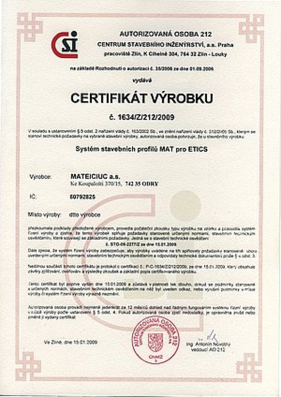 V letošním roce získala společnost MATEICIUC a.s. po časově náročném ověřování v praxi a ověření výrobků ve zkušebnách jako první v republice certifikát na systém stavebních plastových profilů MAT pro ETICS.