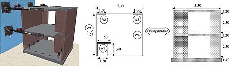 Dalším příkladem je složitější konstrukce, pro kterou ale rovněž existují laboratorní zkoušky. Test byl proveden v rámci evropského projektu ESECMaSE [11], [10]. V laboratořích ISPRA byl ověřen jednoduchý dvoupatrový zděný dům. Podrobný popis zkoušky lze nalézt v příloze [10]. Jedná se o typický malý domek, kde v laboratoři byla testována pouze symetrická polovina (obr. 6). Během experimentu bylo na budovu vyvíjeno vodorovné působení se zvyšujícím se maximálním zrychlením. Na základě výsledků z experimentů byla odvozena pushover křivka jako obálka maximálních sil pro každé podlaží a maximálních posunů.