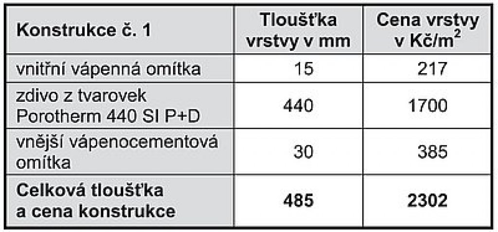 Posledním důvodem častých aplikací zateplených stěn novostaveb je jejich cenová výhodnost. Pro lepší představu uvádíme porovnání parametrů vybraného jednovrstvého a vrstveného zdiva, které bylo zpracováno pracovištěm CSI, a.s. Praha [7] v rámci publikace Snižování energetické náročnosti staveb.