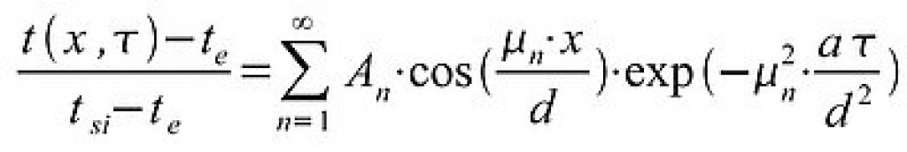 kde t je teplota, která závisí na čase τ a poloze x, dále te a tsi je venkovní resp. vnitřní povrchová teplota. Ve funkční řadě na pravé straně je d tloušťka vrstvy, a je součinitel teplotní vodivosti a konečně An a mn jsou konstanty, které vyplývají z okrajových podmínek. Řada rychle konverguje, takže pro praxi většinou postačí pracovat s prvními dvěma až pěti členy. Z fyzikálního pohledu připomíná řada Fourierův rozklad teplotního pole na monochromatické prostorové teplotní vlny, jejichž amplituda An·exp (- µn2· ατ/d2) klesá s časem τ. Exponenciální výraz popisuje rychlost chladnutí n-té teplotní vlny, v něm se pak µn2· α/d2 nazývá součinitel útlumu (n-té vlny) a výraz ατ/d2 ve [3] se nazývá Fourierovo číslo. Konstantní parametr α/d2, který se objevuje u všech členů rozkladu, je reciprokým vyjádřením ukazatele tepelné akumulace (UTA) podle [4].