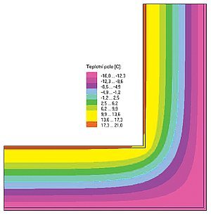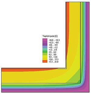 Vlastní snížení množství a oblasti kondenzace se projeví dokonce výrazněji než v ploše u základních detailů – rohu místnosti, překladů, věnců a všude tam, kde je konstrukce nějak tepelně oslabena. Pro ilustraci vlivu zateplení jsme vybrali např. nejzákladnější detail rohu běžné místnosti. Ještě významnější rozdíly bychom nalezli např. u rohů místností s vestavěnou šatní skříní. Detail byl hodnocen s pomocí 2D analýzy teplotních a vlhkostních polí se zahrnutím stěn do vzdálenosti 1,5 m od rohu.