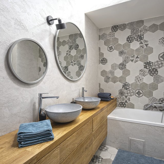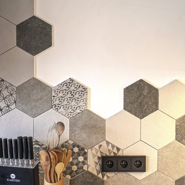 Celý interiér určuje barevná paleta šedé a dřeva. Odráží se i na podlahové krytině z olejovaného přírodního dubu, která je zároveň jedním z designových prvků, pomocí nichž byl byt rozdělen do zón. Jako kontrast k dřevěné podlaze byla pro namáhanější prostory zvolena hexagonální dlažba v odstínech šedi, která je hlavním zdobným prvkem i pojítkem jednotlivých zón. Dle umístění se liší množství tmavých dlaždic, tedy například pod varnou zónou se jich nachází více, zatímco v koupelně jde spíše o světlejší dlažbu a je zde použito více dekorovaných kusů. Přechody mezi dřevěnou a dlážděnou částí podlahy jsou tvořeny spárou vyplněnou tekutým korkem (tmelem z korkové drtě a elastického pojiva, který se používá jako alternativa k PU pěnám). Eisenreichová k tomu dodává: „Nejsložitější bylo vytvořit podlahy v hexagonálním napojení a pak vybrousit stávající podlahu. Celá hexagonální dlažba je totiž spojitá z obýváku přes koupelny až ke vchodu do bytu. Vše zdárně dopadlo 'už' na druhý pokus.”