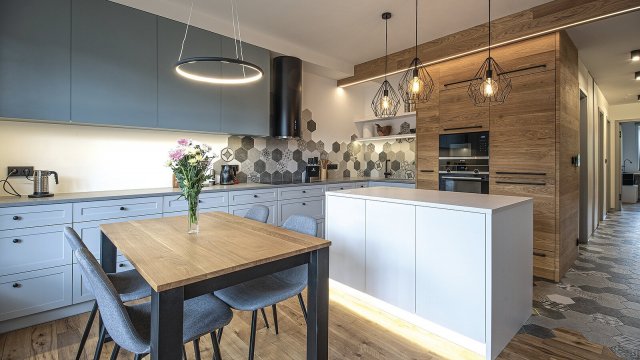 Kuchyně byla vybavena dřevěnými šedomodrými skříňkami, které vyrobil truhlář na míru. Pracovní ostrůvek uprostřed zde plní funkci jakéhosi těžiště a rovněž opticky odděluje varnou zónu od pobytové. Optický předěl místnosti zprostředkovává také použitá dlažba v místech, v nichž organicky prorůstá do původní dřevěné podlahy, která po renovaci vypadá jako nová.
