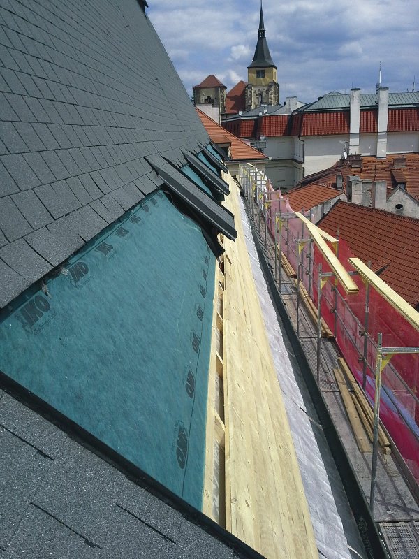 Práce na střeše postupují po částech, menších než je u běžných rekonstrukcí obvyklé. Rychlost a velikost pokládané plochy totiž ovlivňuje nejen prudký sklon střechy, ale také náročnější manipulace s materiály a další faktory. Nejprve se na vybrané ploše strhne stávající krytina včetně separační fólie, dvojité prkenné bednění se zkontroluje a shnilé části se případně vymění. Podle slov Ing. Davida Valcháře, obchodního manažera ze společnosti H & B Delta, to však zatím nebylo nutné. Poté se provede nástřik proti škůdcům a hnilobám. Po vyschnutí nástřiku následuje certifikovaná skladba společnosti HPI-CZ navržená projektantem. Tuto skladbu tvoří parobrzdná fólie, která může sloužit až 14 dní jako dočasná krytina, a dále samotné izolační desky z fenolické pěny formátu 2,40 × 1,2 m tloušťky 60 mm. Ty se přes kontralatě 60 × 60 mm podtmelené systémovým těsnicím tmelem Permo® Seal kotví do krokví.