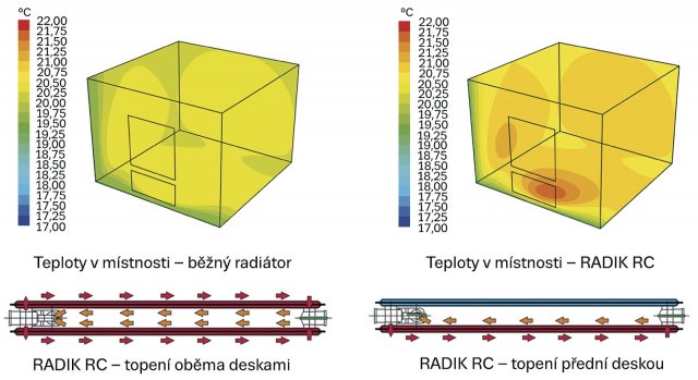 Přestože jmenovitý tepelný výkon radiátoru potřebujeme jen na tři až pět týdnů v roce, musí být k dispozici. Proto je běžný radiátor po většinu provozního času předimenzovaný, pocitově „hřeje” jen jeho malá část a tuto skutečnost nepříznivě vnímá mnoho uživatelů bytů. U RADIKU RC se uzavřením průtoku otopné vody do zadní desky tento nedostatek komfortu odstraňuje. Zajímavým parametrem je teplota povrchu stěny za tělesem. Pokud není zadní deska protékána, tak působí jako teplotní štít, což dokazuje povrchová teplota stěny za ní jen 26,9 °C oproti teplotě 41,9 °C u radiátoru se sériovým protékáním.