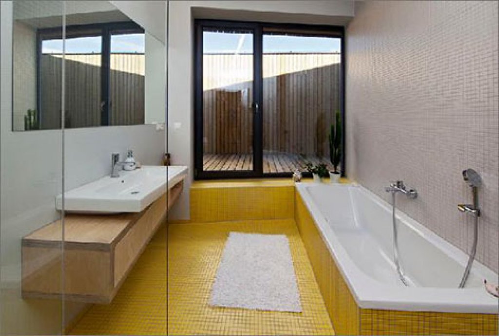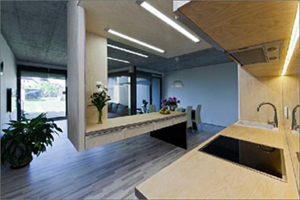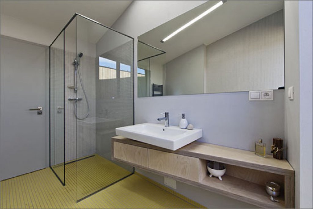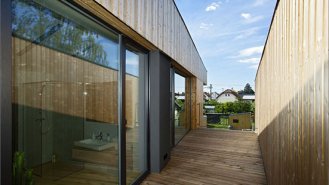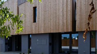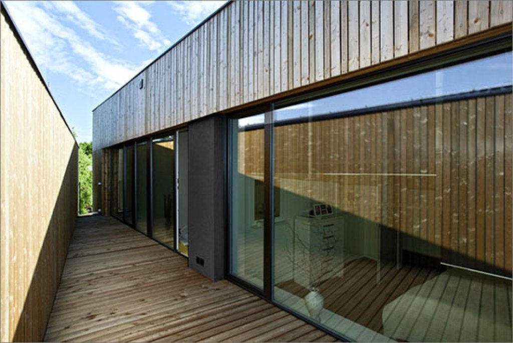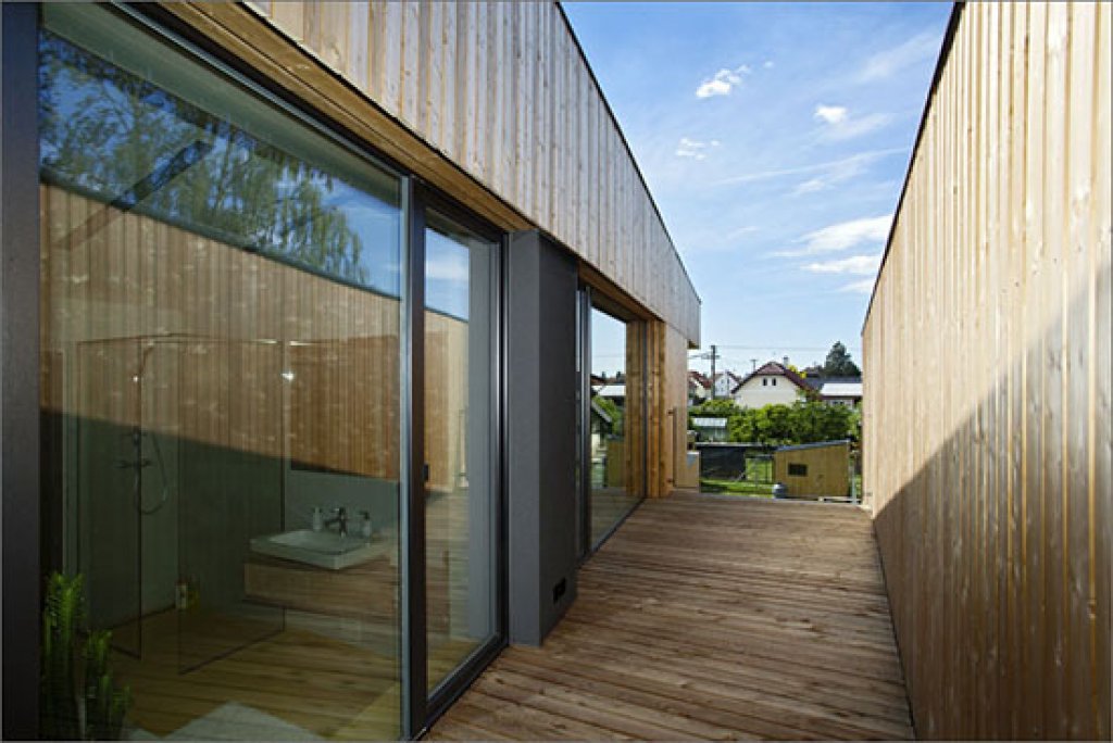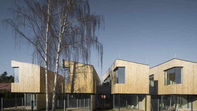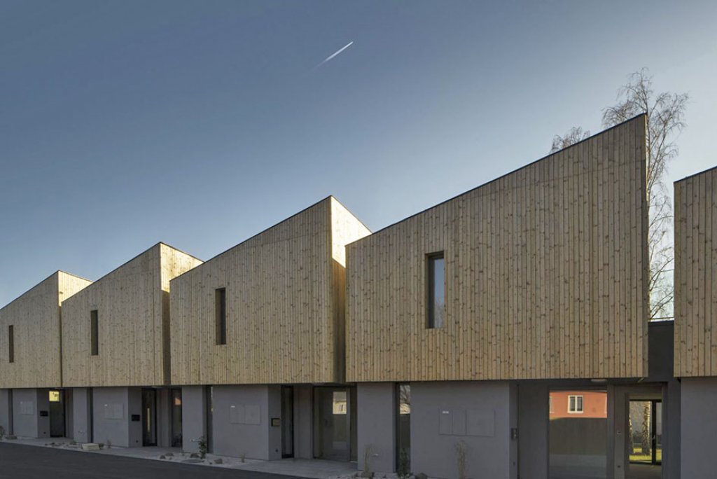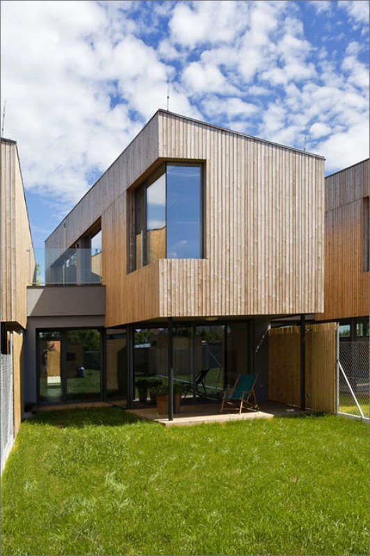 Hmoty domů jsou tvarovány tak, aby bylo dosaženo co největšího soukromí jednotlivých majitelů a zároveň dostatečného osvětlení jednotlivých prostorů a jejich propojení z venkovním prostředím. Střešní terasy se rozšiřují směrem do zahrady, pultové střechy jsou navrženy tak, aby eliminovaly stínění do atria vedlejšího domu. Tvary střech celé sestavě udávají rytmus. V přízemí se nachází vstupní hala, velký obytný prostor, WC, komora a sklad, ten má vlastní vstup a může sloužit jako pracovna, nebo další pokoj. Součástí přízemí je krytá terasa. Sklad zahradních potřeb je řešen samostatně na konci zahrady. V podkroví jsou dva pokoje, ložnice a koupelna. Všechny tyto místnosti jsou prosklené do střešní terasy. Dále je zde chodba a komora. Přízemí řadových domů je omítnuté a opatřené tmavým šedým nátěrem. Patro je opláštěné impregnovanými svislými smrkovými prkny.