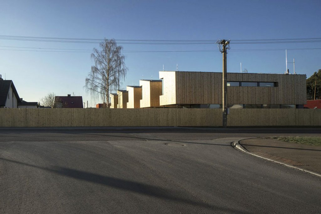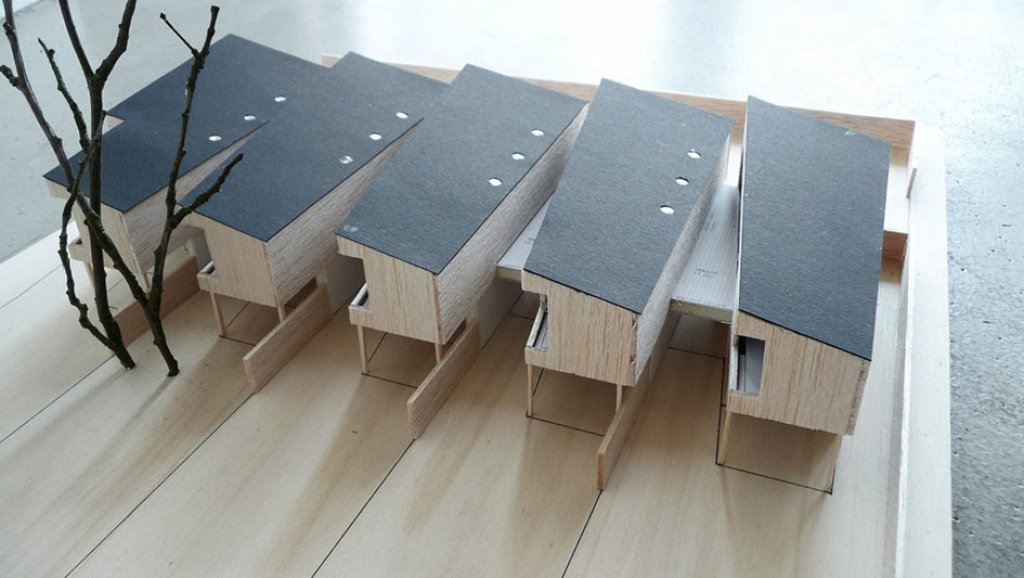Stavební parcela se nachází v obci Zruč u hlavní silnice. Na pozemku původně stál jeden větší rodinný dům. Navrhli jsme zde pět řadových domů tak, aby zahrady byly orientovány na jih a do silnice nepůsobila hmotně řada domů, ale pouze bok. Zároveň je tím dosaženo částečné hlukové odclonění dopravy ze silnice. Každá zahrada má samostatný přístup z jihu. Parkování je mimo dům na severu.