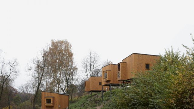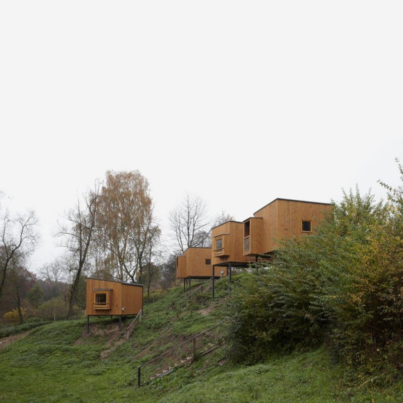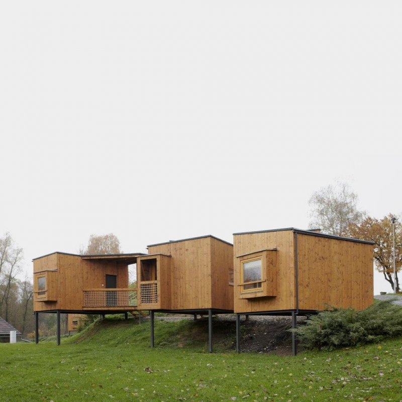 Pro umístění nových, prostě vybavených chat, byl zvolen dramatický nevyužívaný svah orientovaný ke stromořadí na cestě z Dubé. Chaty jsou spolu s novou zelení rozsázeny po úbočí a svou tvarovou rozmanitostí a zdánlivou nahodilostí tvoří pitoreskní svět „ptačích budek“. Bydlení v korunách stromů. Jednoduché jednoprostorové objekty s dřevěnou sloupkovou konstrukcí (ztuženou překližkovými deskami) jsou založeny na zemních vrutech / železobetonových patkách a vynášeny ocelovým svařovaným rámem. Jako zázemí pro ubytované hosty slouží nedaleko stojící umývárny.