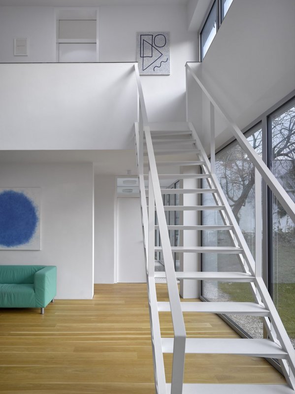 V prvním podlaží je kuchyně s jídelnou navazující na hlavní obytný prostor, který se může posuvnými dveřmi opticky oddělit. Dále je zde prádelna, sklad a malá koupelna s WC. Celé podlaží je v přímém kontaktu se zahradou a ovocnými stromy. Ve druhém nadzemním podlaží jsou dvě ložnice, pracovna a druhá větší koupelna využívající shoz prádla do prvního podlaží. Stínění domu je řešeno exteriérovými screenovými roletami opticky ukrytých do integrovaných kapes ve fasádě.