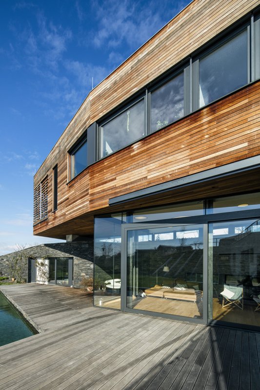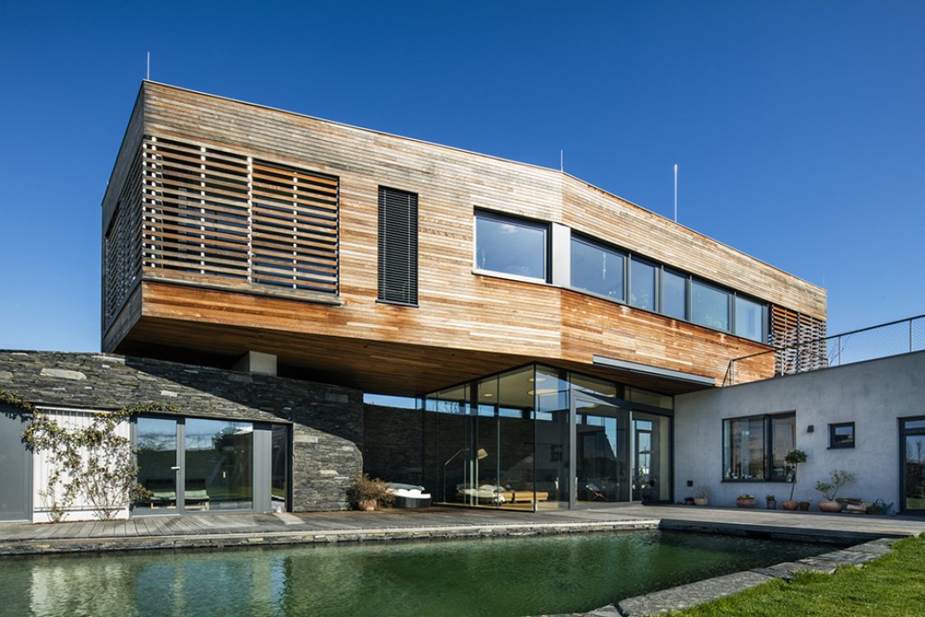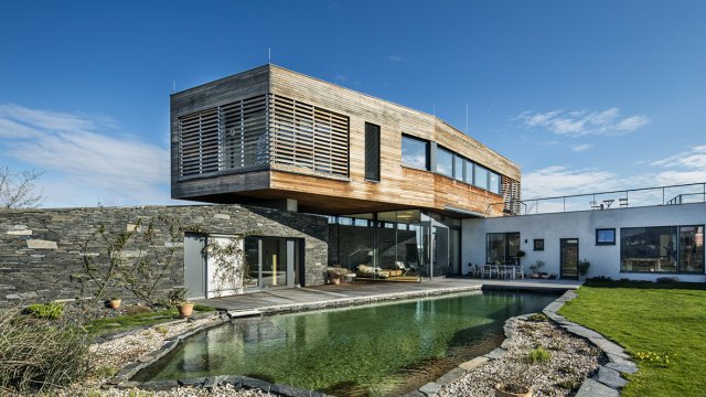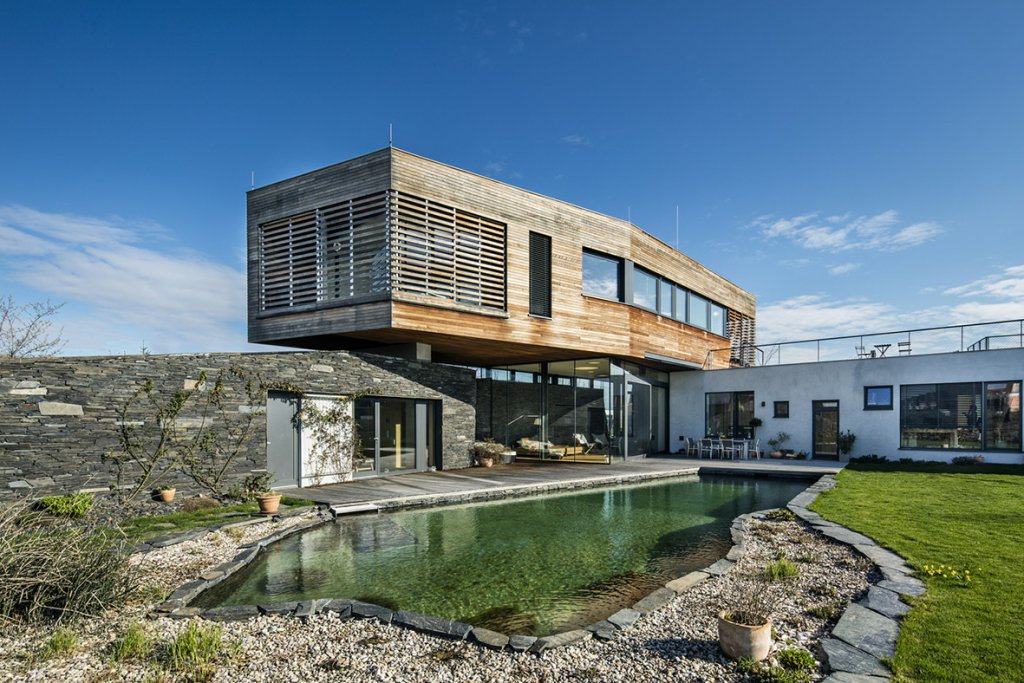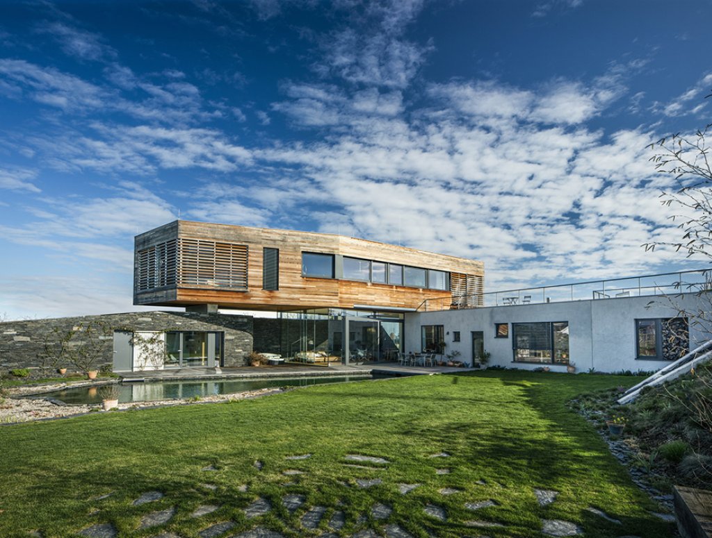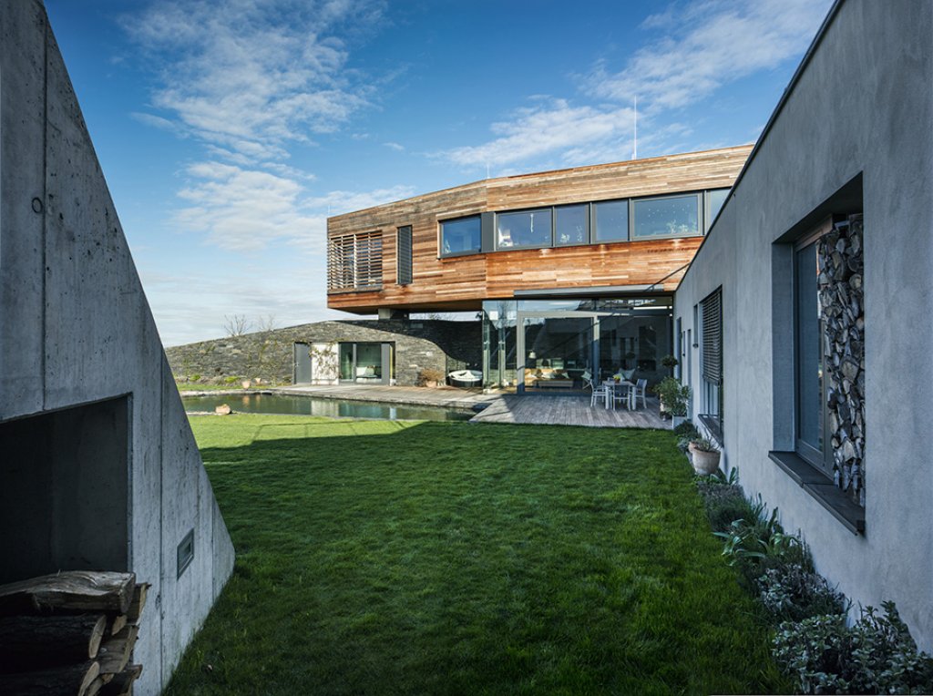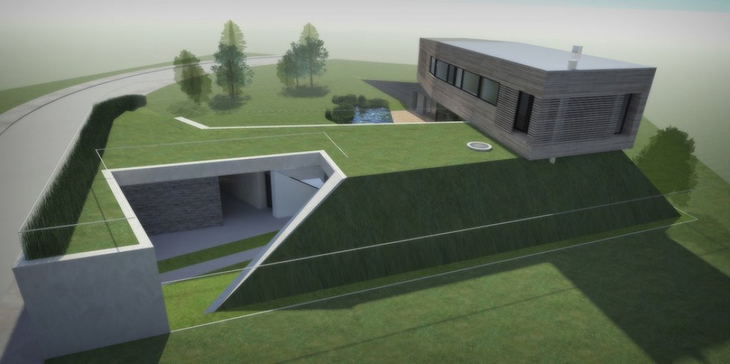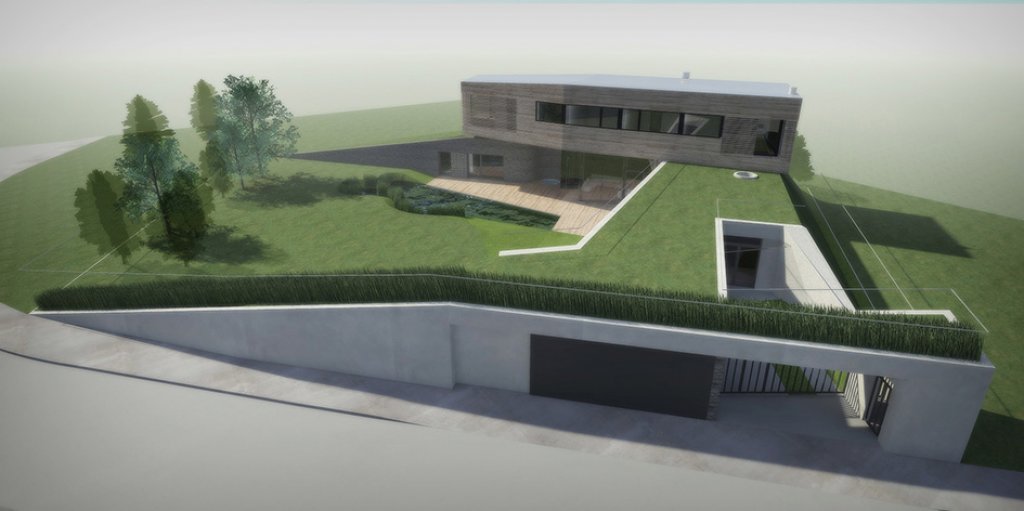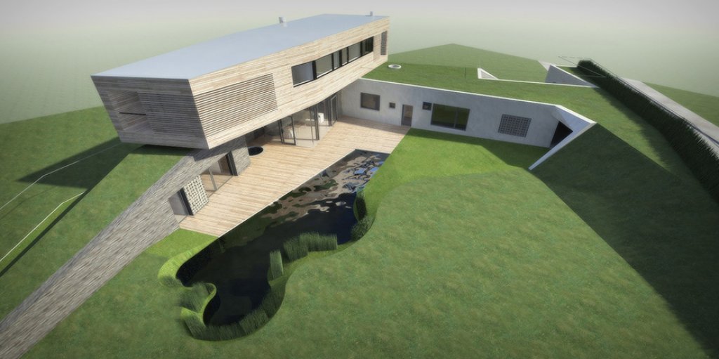 Představujeme si budoucí zástavbu, další satelit, který vznikne bez jakýchkoli pravidel. Jak zachovat intimitu bydlení a zároveň nezatěžovat okolí zbytečnými architektonickými nápady? Zelený val podél hranic pozemku a nad ním vznášející se dřevěný objekt. Variace na atriový dům. Propyleje vstupu se sklobetonovou plastikou (oko – tvořené otisky rukou členů rodiny); prostorově i světelně modelovaná cesta zakončená jídelním stolem; vlastní obytný prostor, zcela otevřený do oázy zahrady, vizuálně s ní propojený břidlicovou stěnou - prostor kontinuálně přecházející z interiéru do exteriéru; masivní kovové, křížové sloupy, vynášející ložnicové patro. Sauna, garáž, skladovací a úložné prostory pod snižujícími se valy. A hlavně zahrada – terasa, skalka, koupací bio-jezírko, louka a trávník, platan, břízy a vistárie, na střeše, mezi netřesky a rozchodníky, zeleninové záhony, na svazích lesní jahody. Zelené návrší a nad ním vznášející se hmota – dva principy, dva stavy v jednom celku. Řešení zahrady: Ing. arch. Zdeněk Sendler Výtvarné dílo: Mgr.A. Pavla Šípová Gregorová.