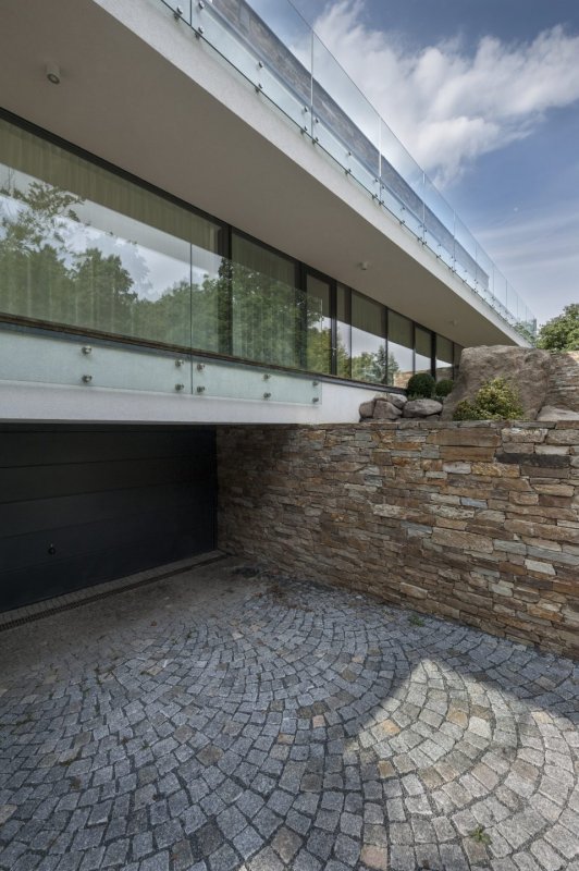 Objekt je složen ze dvou základních jednoduchých hmot, z nichž ta spodní, tedy hlavní obytné podlaží domu, je z části zapuštěna v terénu. Její do zahrady orientované plochy jsou celoplošně bezrámově prosklené a umožňují propojení interiéru se zahradou. Proti svahu a směrem k sousednímu pozemku na severovýchodní straně je hmota přízemí vymezena opěrnými zdmi z lomového kamene. Stejný obklad pak pokračuje i v interiéru.