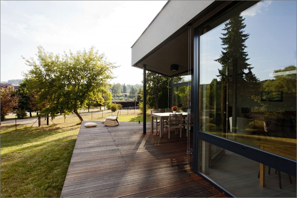 Toto rozmístění poskytuje bohaté proslunění místností. Střecha domu je navržena jako plochá ukončená atikou. Při vjezdu na pozemek je umístěno kryté parkovací stání, jehož zastřešení navazuje na střechu domu. Přesahy střechy nad vchodem do objektu umožňují komfortní suchý přechod do samotného domu. Terasa je navržena na jižní straně objektu. Navržená zeleň doplňuje výhledy a vytváří částečně stínění zahrady.