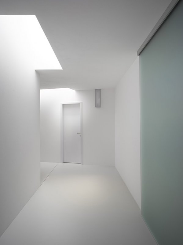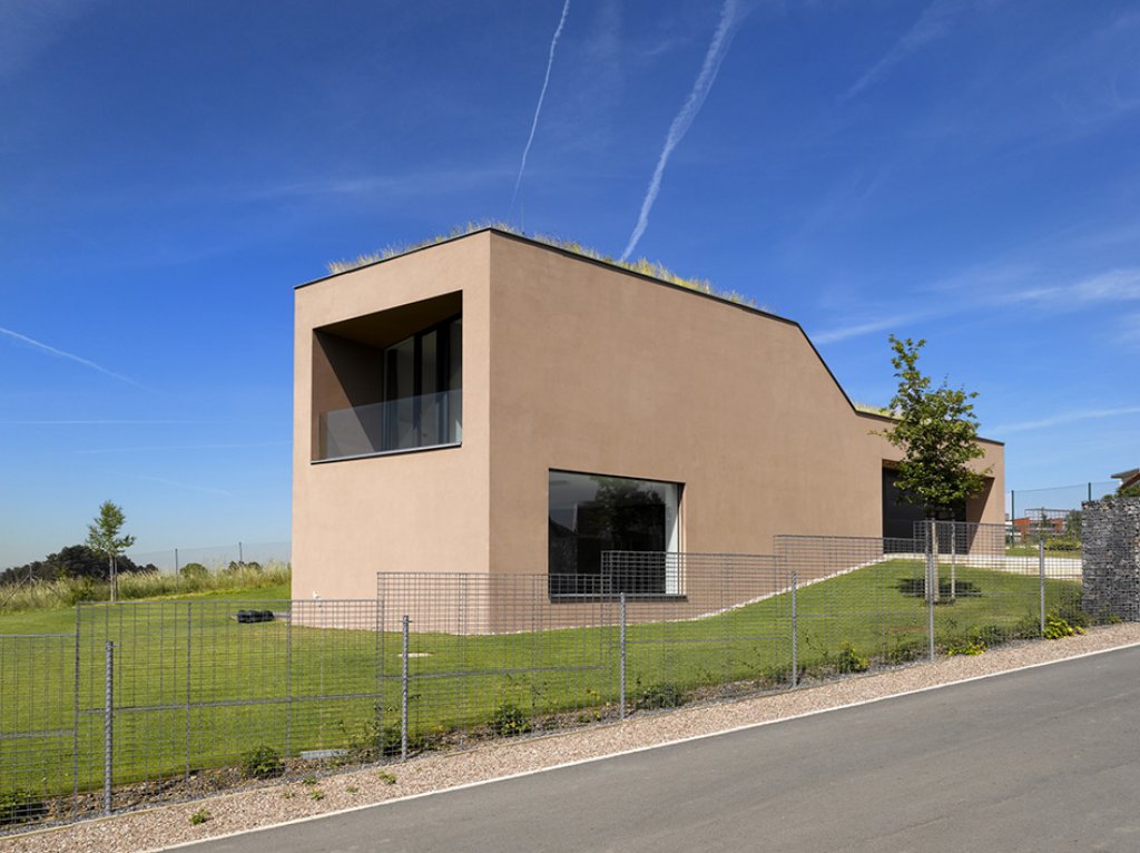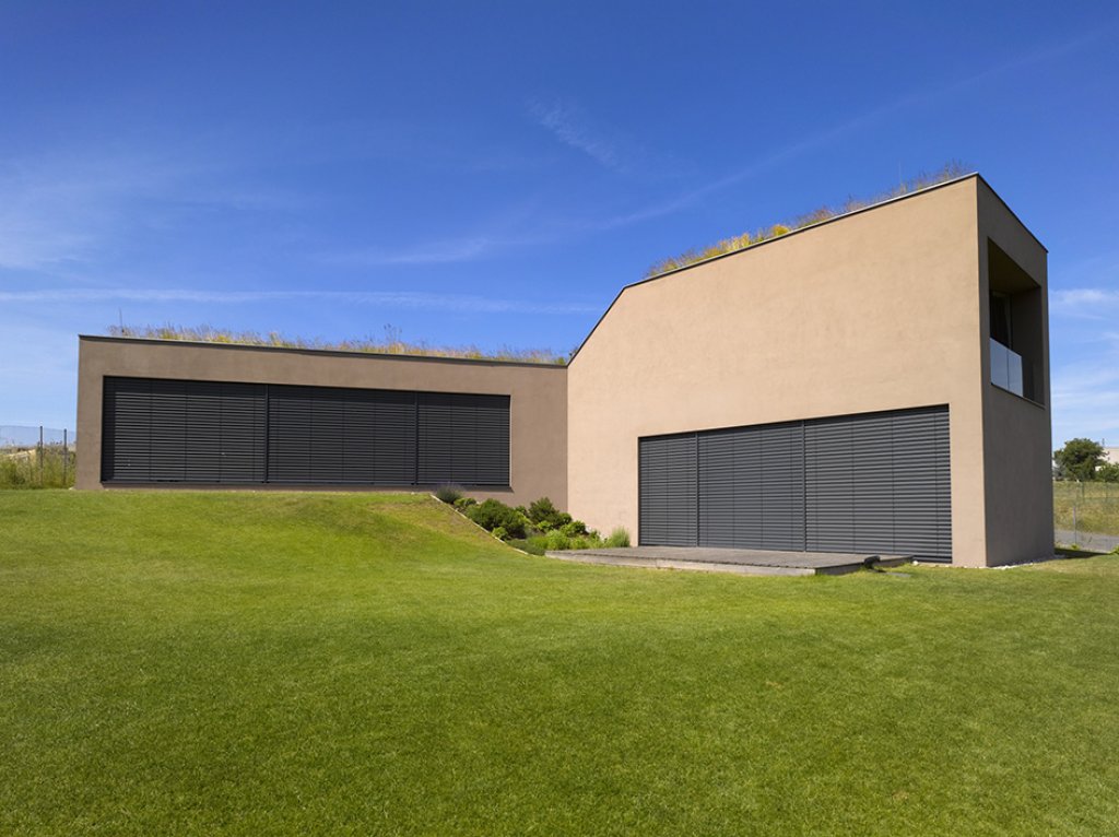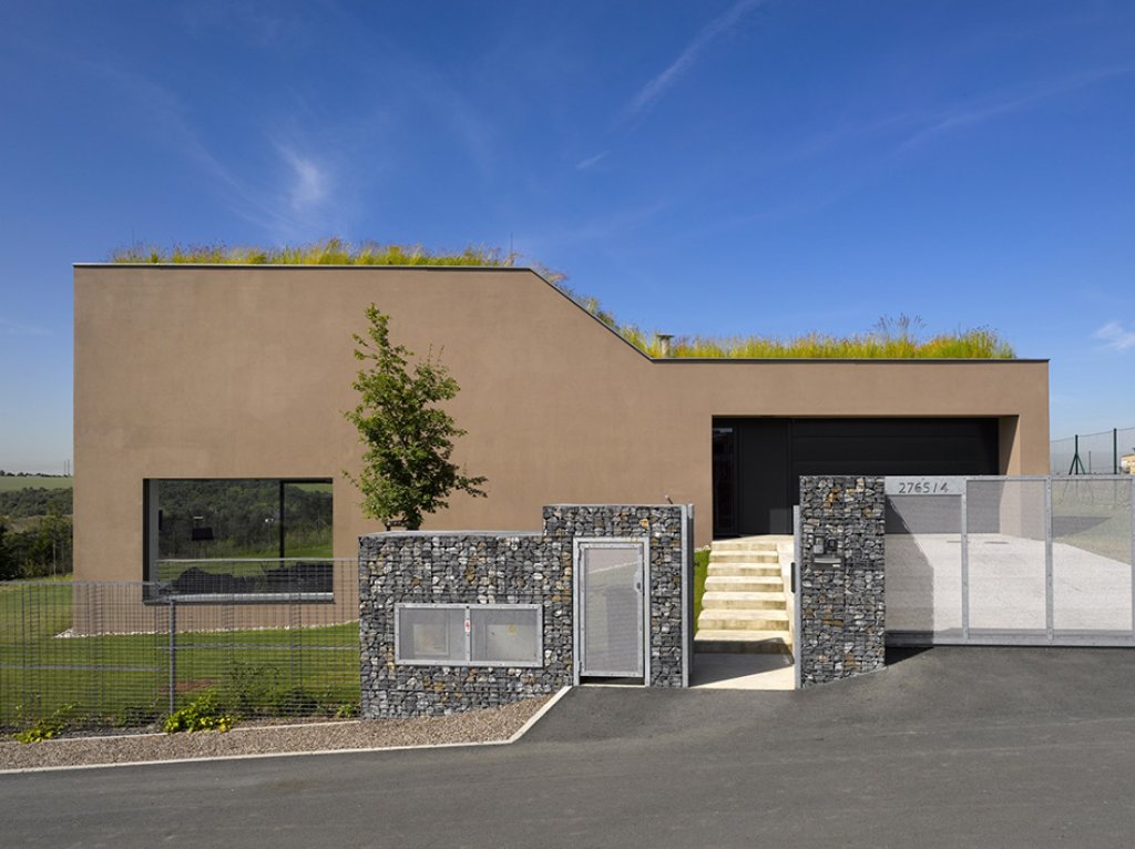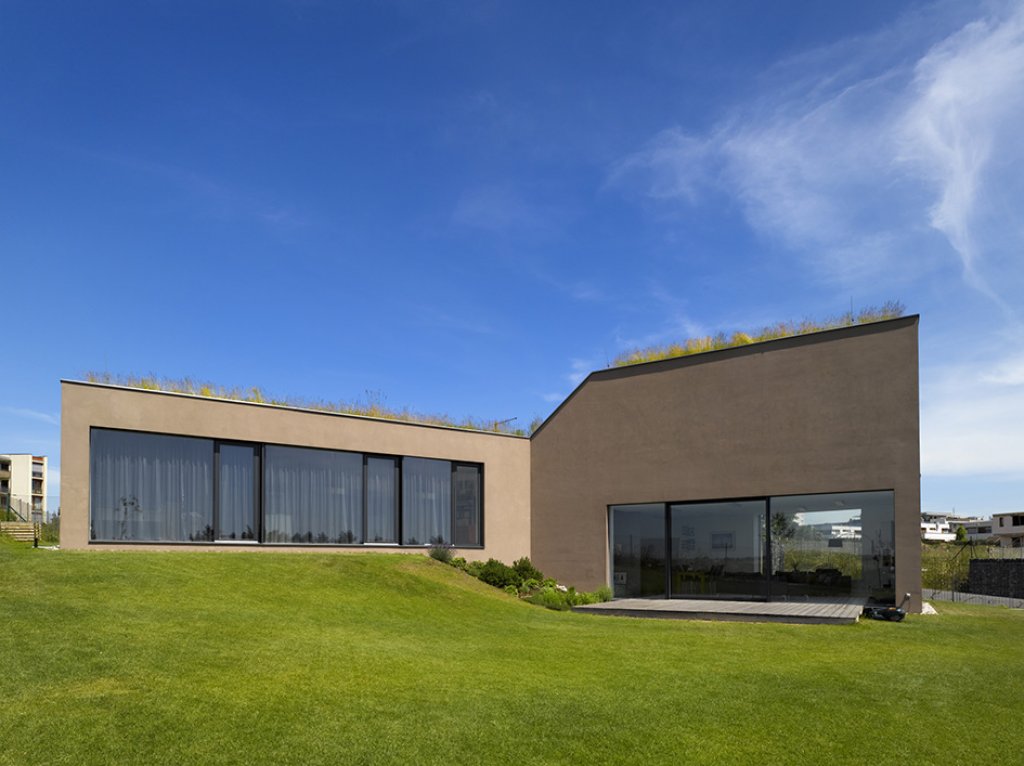 Vzhledem ke svažitému terénu dům v jihovýchodním rohu hmotově graduje. Tato gradace je podpořena tvarováním domu a jeho zúžením v koncové části. Proporce příčného řezu domu postupně přechází z jednopodlažní široké hmoty na hmotu převýšenou dvoupodlažní a úzkou. V reakci na svažitý terén je dům rozčleněn na dvě části vzájemně posunuté o polovinu podlaží. V jednopodlažní části položené podél vrstevnic jsou umístěny dětské pokoje orientované jižním směrem, severním směrem jsou pak orientovány místnosti zázemí a garáž. Dvoupodlažní část je o polovinu podlaží snížena tak, aby denní obytná část měla přímý výstup do zahrady. Nad obývacím pokojem s kuchyní je umístěna ložnice. Jednoduchá hmota domu pojednaná v jednotném materiálu – hladké hnědošedé omítce je prořezána pouze několika velkými otvory. Ty jsou převážně bezrámově zaskleny, případně vyplněny antracitovými okenními rámy, resp. vraty.
