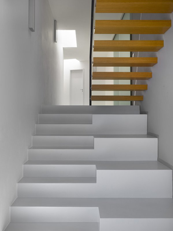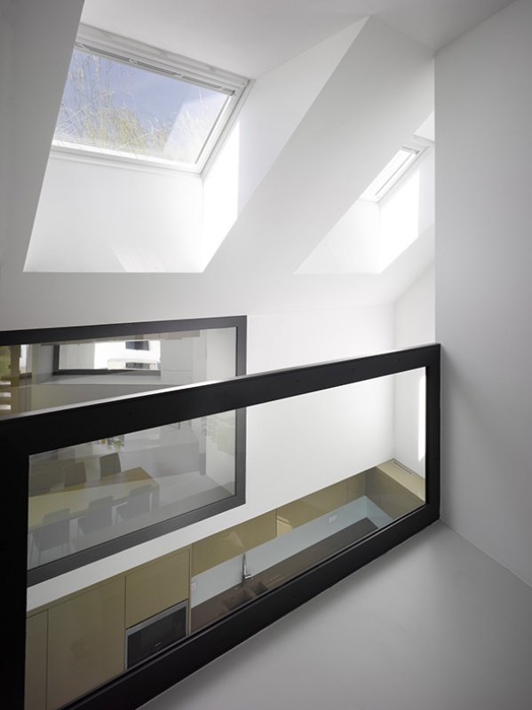 Dům půdorysného tvaru L je umístěn při severní hranici pozemku. Dvoupatrovou částí dům kopíruje východní hranici ve vzdálenosti určené uliční čáry. Obytné prostory jsou tak v sevření domu orientovány jihozápadním směrem. V jihozápadním rohu parcely vzniká hlavní pobytová plocha, s terasou v návaznosti na obývací pokoj. Dům půdorysného tvaru L je zasazen do terénu svojí jednopodlažní části podél vrstevnic, dvoupodlažní část se pak vysouvá napříč vrstevnicím.