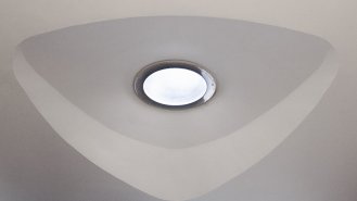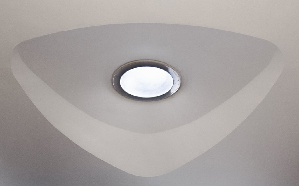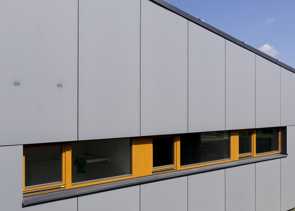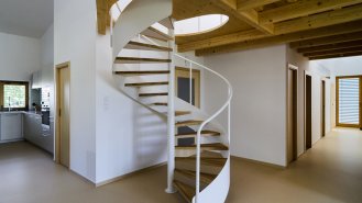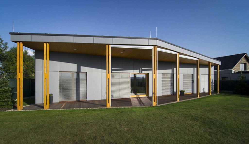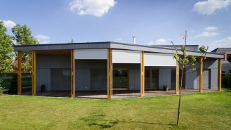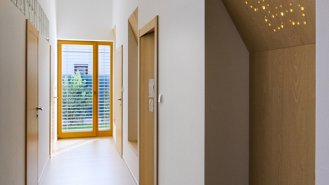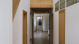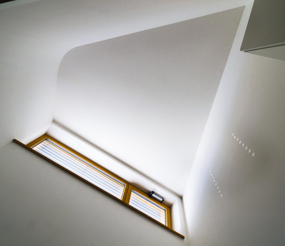 Střecha směrem do zahrady je přetažena a vytváří exteriérový prostor pro pobyt. Důležité střídání měřítek prostorů začíná v hale, kde je oproti závětří mírné uvolnění podpořené segmentovým trojúhelníkovým světlíkem. Vstup do obytné části začíná stlačením pod galerií a okamžitým uvolněním vstoupením do obytného prostoru. Jídelna pak graduje převýšením v hřebeni. Hladkost přechodu obytného prostoru do jídelny je artikulována zaobleným rohem. Vzniká tekutost prostoru. Důležitým prvkem byla přístupová část k pokojům, která je prolomena nikami s umístěním lavic a osvětlením. Provozně prostor umožňuje semiprivátní setkávání uživatelů. Pro zachování homogenní fasády byly vyloučeny cizí prvky a nutné perforace odvětrání jsou provedeny paterny. Ty byly provedeny CNC přímo na desku.