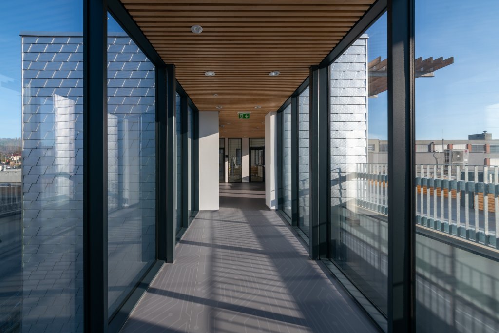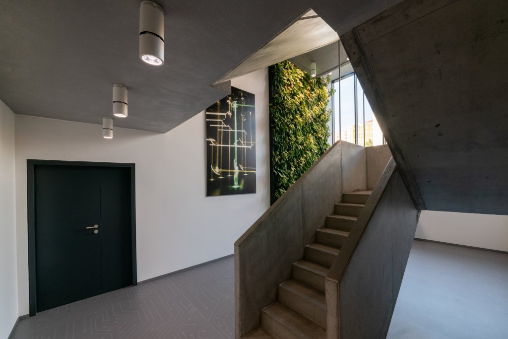 Dominantou interiéru je nepochybně vstupní schodiště z pohledového betonu, který opticky zjemňuje zelená stěna a výrazné prosklené plochy. Maximální transparentnost a světlost byla jedním z cílů návrhu. Minimalistickou paletu bílé, šedé a antracitové zjemňují obklady a podhledy z dřevěných lamel, které dodávají prostoru strukturu a vizuální přívětivost.Z horních podlaží je možné vyjít na terasu v úrovni střechy původní budovy. Ta slouží nejen jako relaxační zóna pro zaměstnance, ale také jako místo s výhledem na okolní krajinu.
