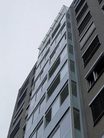 Oproti betonovaným balkonům je řešení poskytované společností ALUMISTR SE odlehčené, subtilní a dodává domu moderní vzhled. Pevná ocelová konstrukce si výborně rozumí s bezúdržbovým hliníkem, z něhož nejsou jen lamelové podlahy nových lodžií. Hliníková jsou také zábradlí s bezpečnostním sklem a lodžii na nejvyšším poschodí chrání před deštěm střešní krytina ze skla a hliníku. K čistotě výrazu přispívá zasklení, jehož montáž celou realizaci uzavírá. Toto elegantní a zároveň praktické řešení lodžiím zajistí ochranu proti hluku, prachu, exhalacím i nepříznivému počasí. Zasklívací systém navíc snižuje tepelné ztráty, má dlouhou životnost a bezúdržbový provoz.