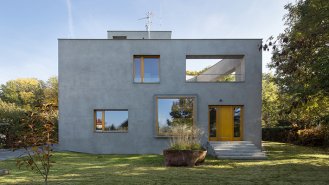 Dům tímto směrem hledí přes zahradu k oboře Hvězda, která je v jeho těsné blízkosti. Objekt připomínající nepravoúhlý krystal v zeleni zahrady je dvoupodlažní, částečně podsklepený, s plochými střechami a střešní nástavbou. Ústřední roli hraje v přízemí obývací pokoj, který velkými okny propojuje přední a zadní zahradu. Dále se v tomto podlaží nachází kuchyň s jídelnou a pokoj rodičů. První patro je vyhrazeno pro děti. Jejich pokoje mají výstup na střešní terasu. Výrazné materiálové řešení interiéru, užití pohledového betonu v kombinaci s dubovým dřevem, dává vyniknout přirozené kráse materiálu.