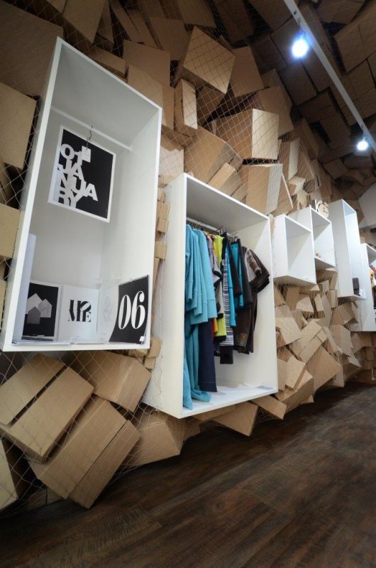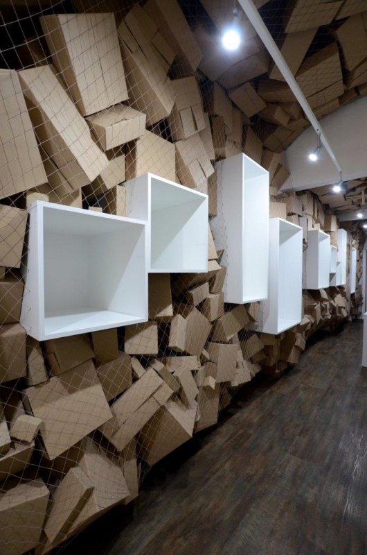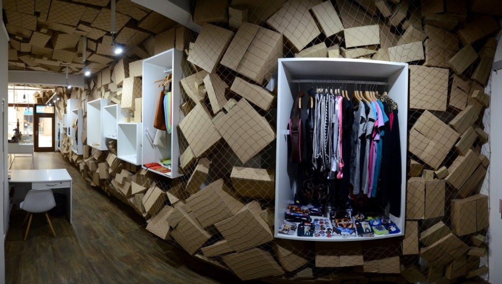 Používáme materiál, který se bude jednoduše aplikovat, a vytvoří nosnou linku interiéru. Síťovina tvoří hlavní motiv, krabice poslouží jako výplň. Tyto prvky jsou následně využity pro balení zakoupeného výrobku. Zákazník si odnáší „identitu“ v síťovce.