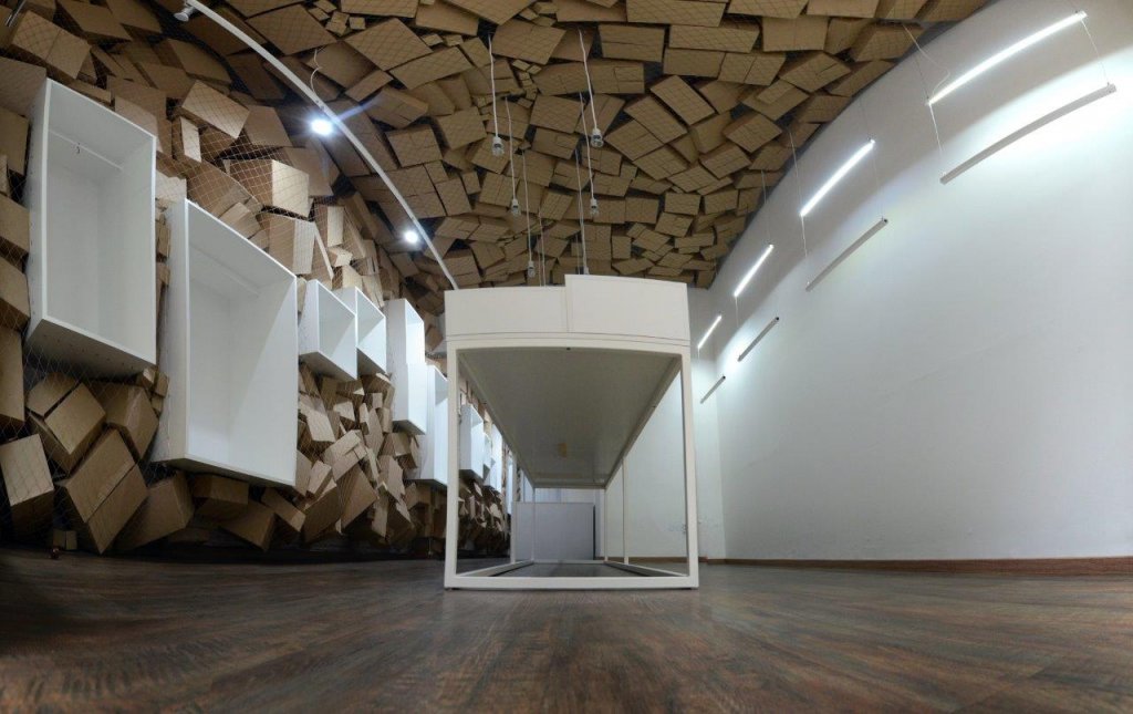 Architektonické řešení a konstrukční řešení Dominantní strukturální stěna, která plynule přechází do stropní části, tvoří hlavní motiv interiéru, a stává se důležitým výstavním prostorem. Konstrukci strukturální stěny tvoří zavěšená síť. Rozmístění krabic zajišťuje plné zakrytí stěny a stropu bez stavebních úprav. Výstavní mobiliář je součástí strukturální stěny, nebo je volně rozmístěn v prostoru.