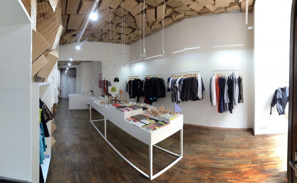 Návrh kombinuje čistě bílé prvky s jemným odstínem březové překližky, kartonu a síťoviny. Světlé a teplé barvy navozují příjemnou atmosféru, která však neruší vystavení designových produktů. Detaily tvoří drobné kotvící doplňky, ocelová lanka.