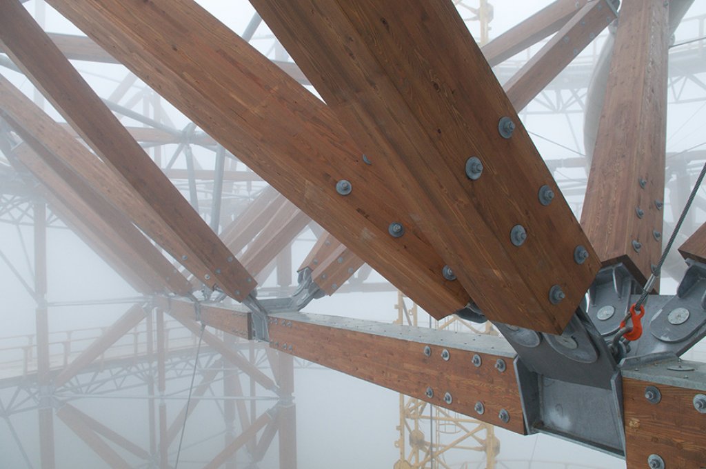 - Na stavbu se spotřebovalo celkem 380 tun oceli, 300 m3 modřínového lepeného lamelového dřeva a 250 m3 hoblovaných hranolů. Modřín pochází z Rakouských Alp a roste v nadmořské výšce nad 1 000 m. n. m.