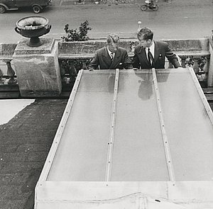 Dva zaměstnanci s dvojitým střešním oknem VELUX typu B (1947)