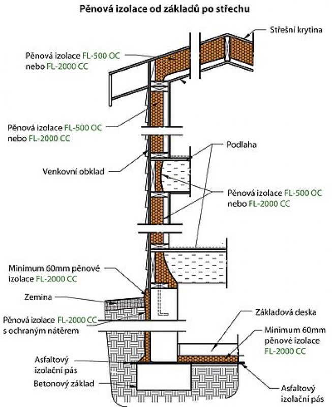 Využití vzduchotěsné zábrany vytvořené FL-500 pěnovou izolací by se mělo stát základním řešením při navrhování střech a podkrovních sestav, při izolacích podkroví, půdních vestaveb, klenutých stropů, podhledů, stěn, podlah apod.
