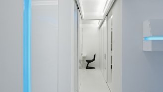 Záměrem bylo vytvořit monochromatický prostor, kde lze experimentovat se světlem. Bílá barva má spoustu odstínů, tónů, valérů. V průběhu dne slunce interiér zaplavuje teplým světlem o teplotě okolo hodnoty 5 730 K (cca 5 500 °C), zatímco večer umělé osvětlení působí chladivě, protože je zbarvené do modra, což připomíná chlad oblohy a ledu (přestože touto barvou září hvězdy, rozpálené na 7 500 °C). Umělé světlo vrhá jiné stíny, zvýrazňuje jiné prvky, interiér se proměňuje. Barevné RGB LED pásky skryté v nikách nábytku umožňují dynamické zabarvení prostoru. Dokáží "vymalovat" podle aktuálního přání.