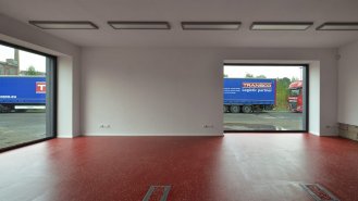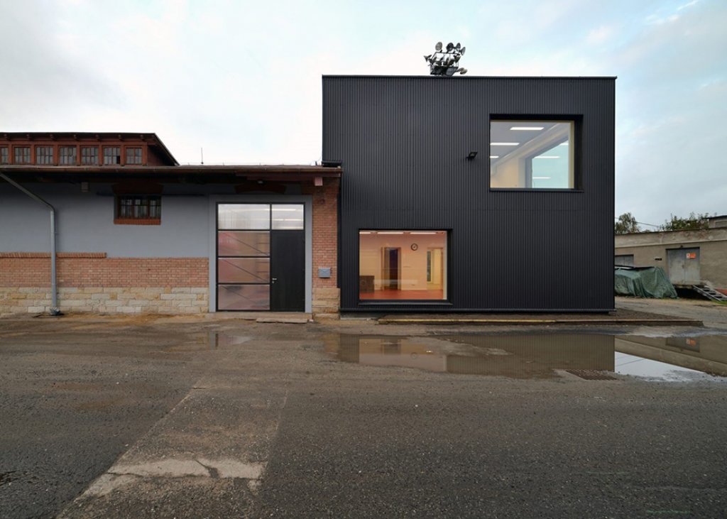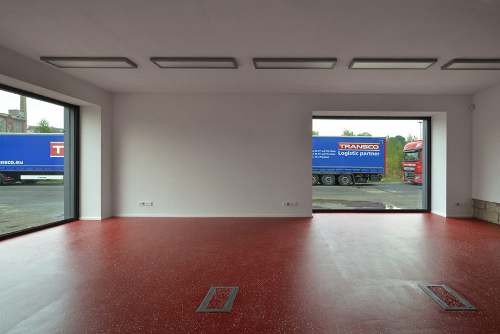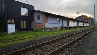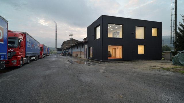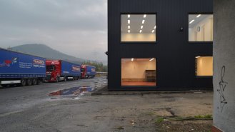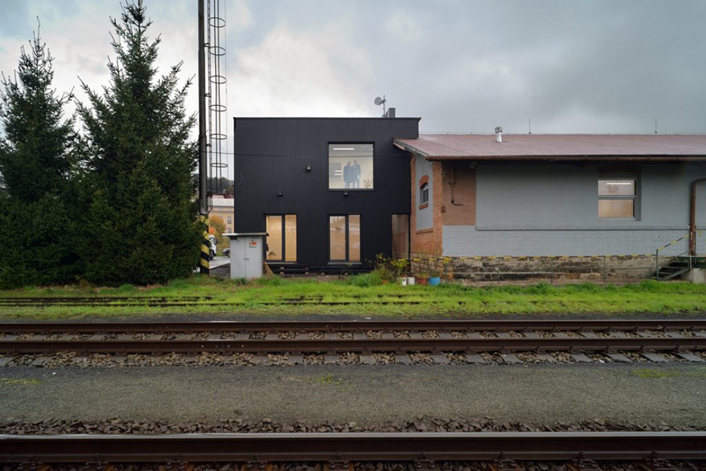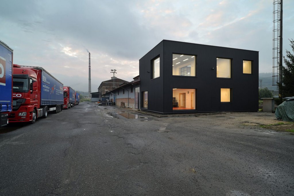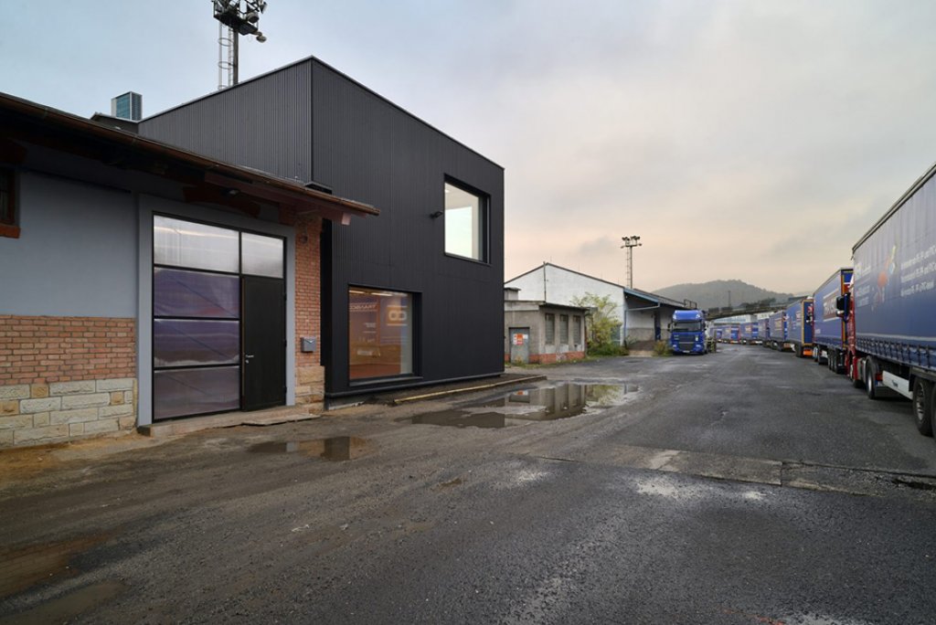 Pro stavebníka – spediční firmu výhodná poloha v paradoxu periferie uvnitř městské struktury. Po úvahách o vestavbě firemního zázemí do prostoru skladu, jsme se posunuli k záměru oživit nedávno špatně rekonstruovaný, nyní ladem ležící domek při krátkém čelním štítu skladu. Bouráme neforemnou sedlovou střechu (produkt předchozích stavebních úprav) a stavíme prostorově efektivnější patro se střechou plochou. Velká pevná okna abstrahující plášť, umožňují speditérům dobrou kontrolu provozu kolem a nostalgicky obhlíží blízkou železnici a přilehlá periferní panorámata nemilosrdně drcená časem. Profilovaný fasádní plech odkazuje jednoduše k principu kontajnerové dopravy.