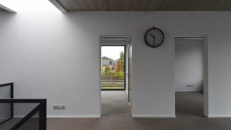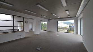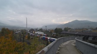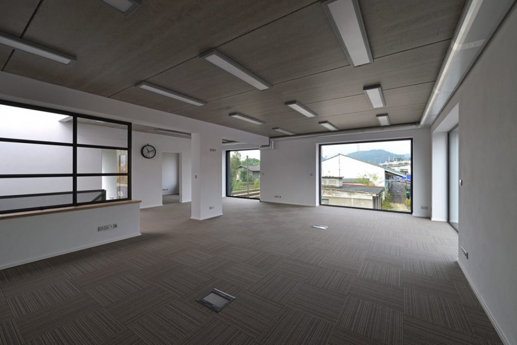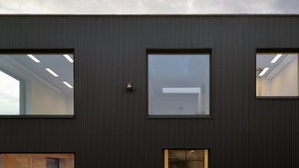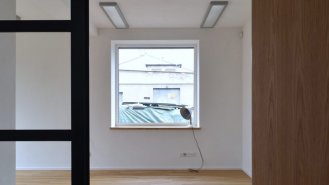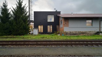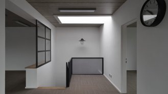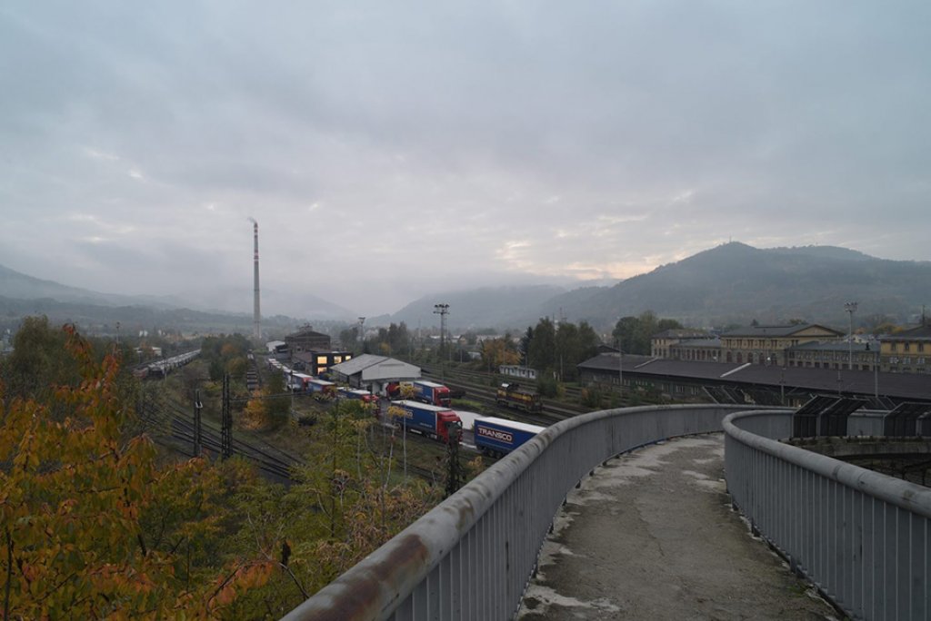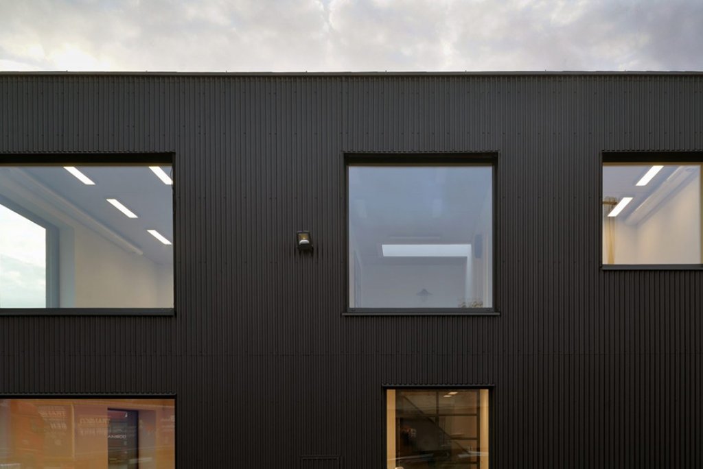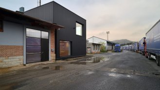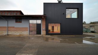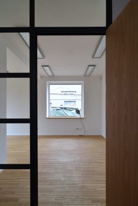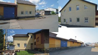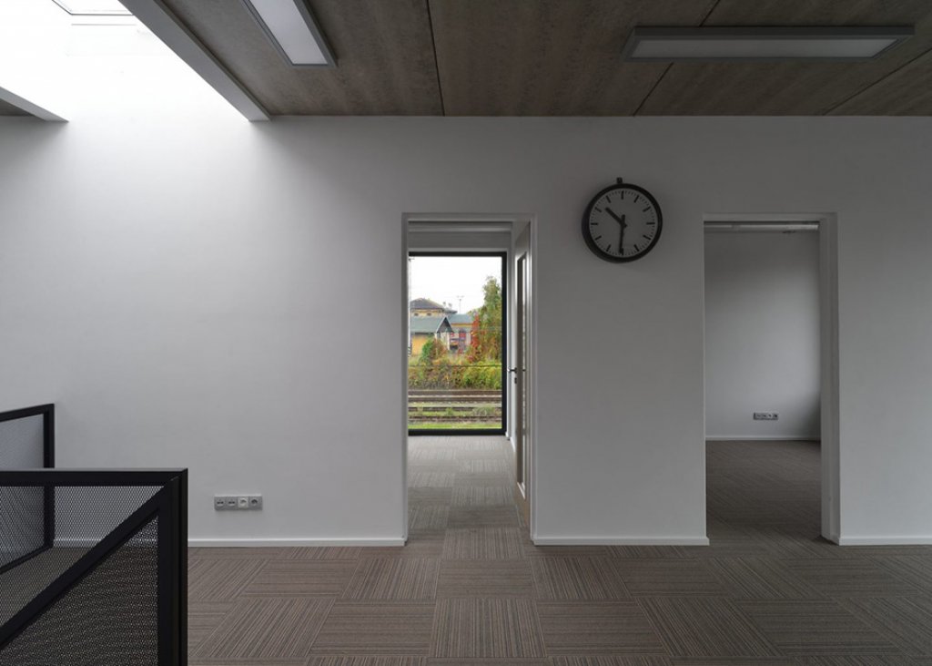 Pro stavebníka – spediční firmu výhodná poloha v paradoxu periferie uvnitř městské struktury. Po úvahách o vestavbě firemního zázemí do prostoru skladu, jsme se posunuli k záměru oživit nedávno špatně rekonstruovaný, nyní ladem ležící domek při krátkém čelním štítu skladu. Bouráme neforemnou sedlovou střechu (produkt předchozích stavebních úprav) a stavíme prostorově efektivnější patro se střechou plochou. Velká pevná okna abstrahující plášť, umožňují speditérům dobrou kontrolu provozu kolem a nostalgicky obhlíží blízkou železnici a přilehlá periferní panorámata nemilosrdně drcená časem. Profilovaný fasádní plech odkazuje jednoduše k principu kontajnerové dopravy.