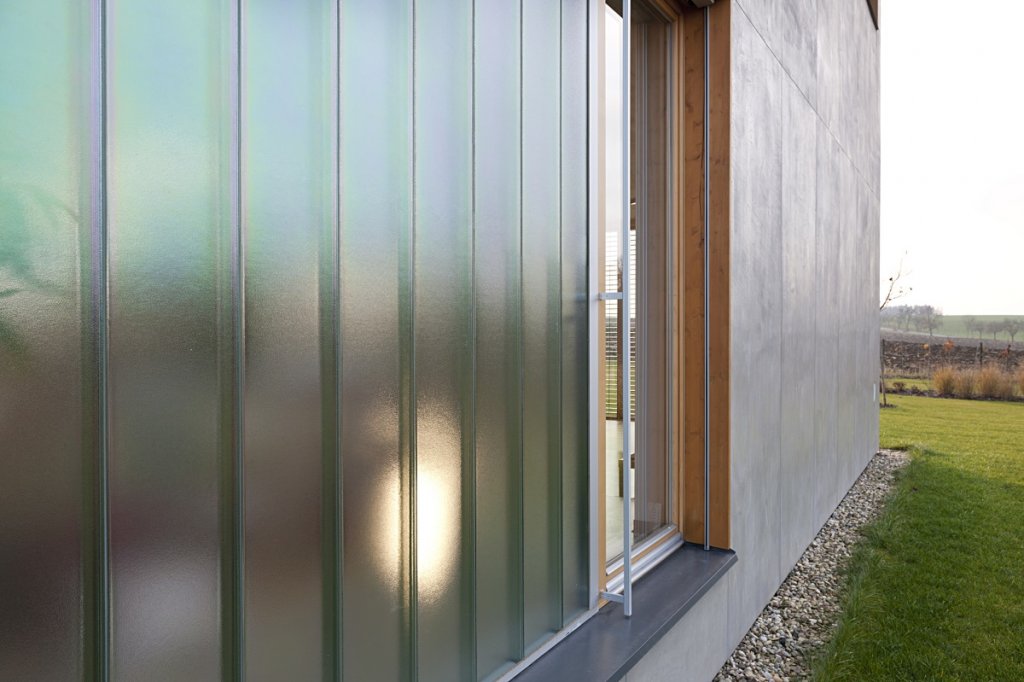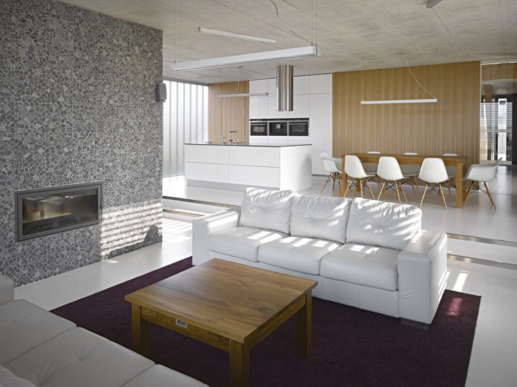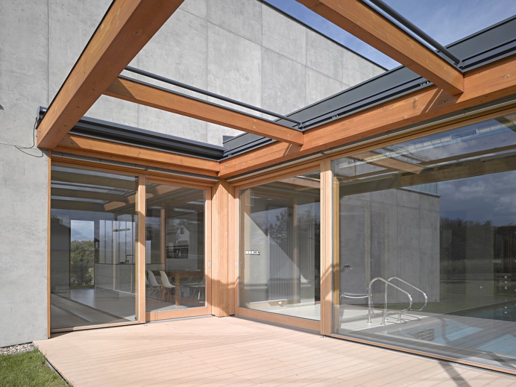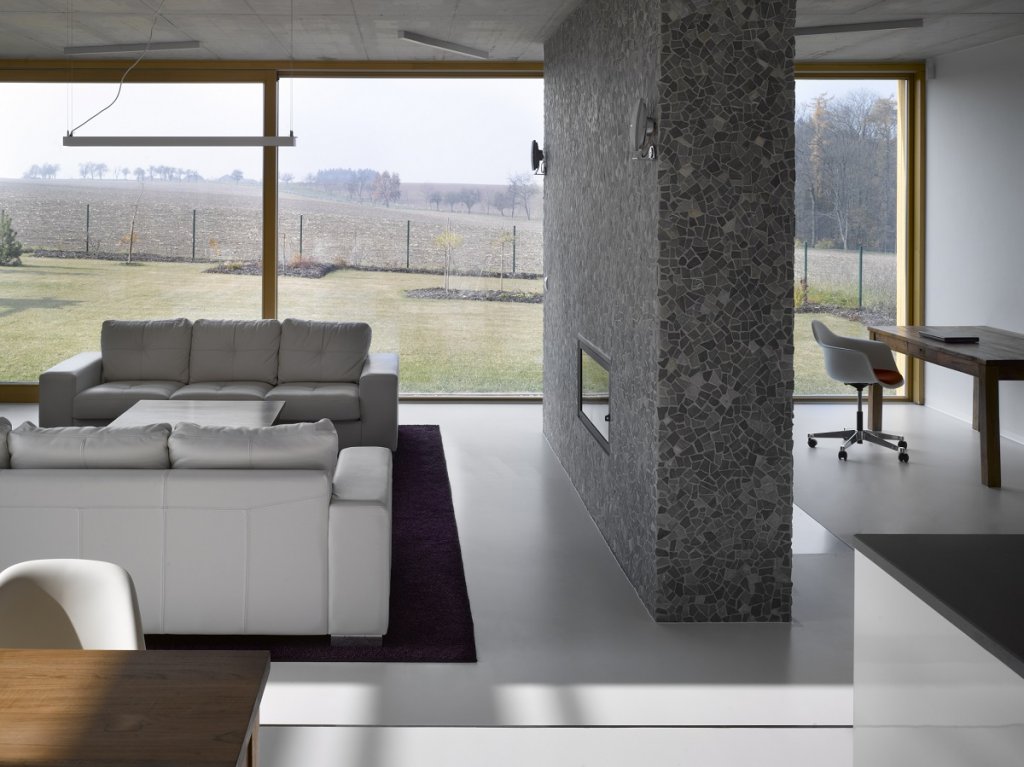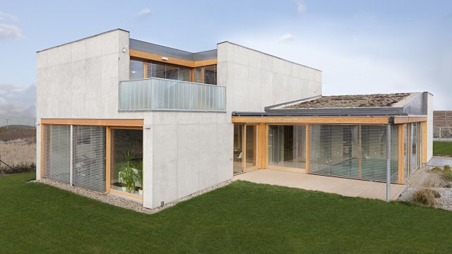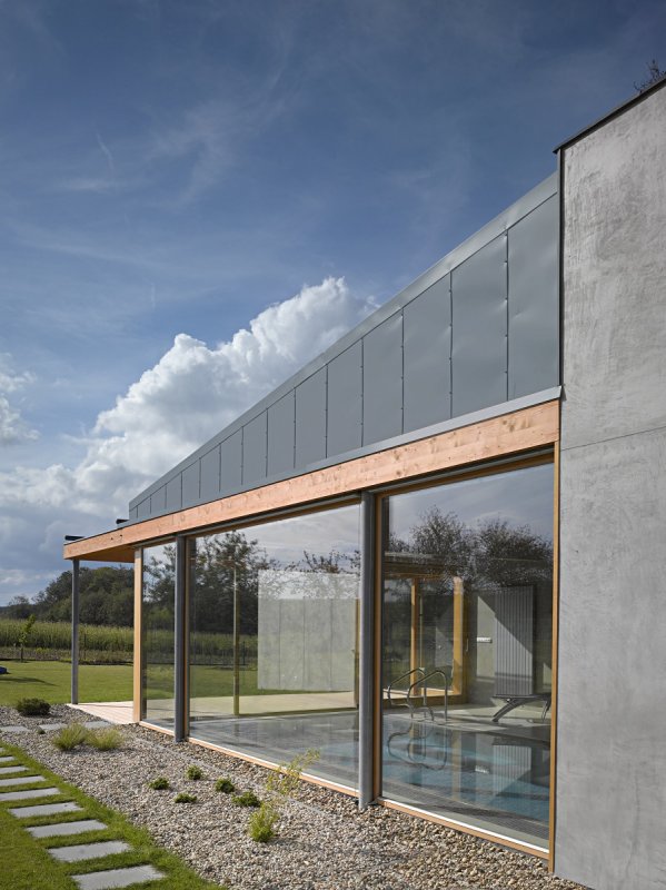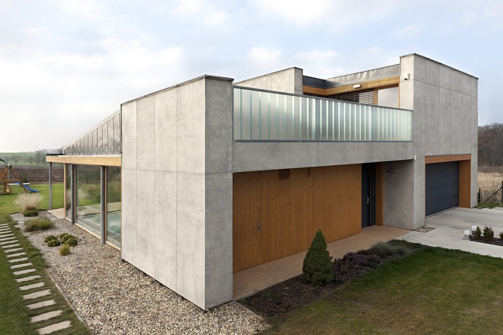 Posuvné prosklené výlohy propojují obytný prostor se zahradou. Lodžie v patře jsou sochařsky vykousnuté do betonové hmoty domu a jsou s bazénovou halou řešené ze dřeva, skla a šedého plechu. Zábradlí na terasách a část severní fasády je z copilitů. V kontrastu se zahradní otevřeností domu je z uliční strany dům pohledově uzavřený. Přiznané konstrukční prvky betonového stropu 1.NP a trámového krovu ploché střechy v 2.NP ukazují tektoniku domu, která je součástí architektury interiéru. Obklady stěn, schodiště, dveře a vestavný nábytek jsou z jasanové dýhy, krbová stěna je obložena kamennou mozaikou, v celém domě je litá průmyslová podlaha s podlahovým vytápěním.