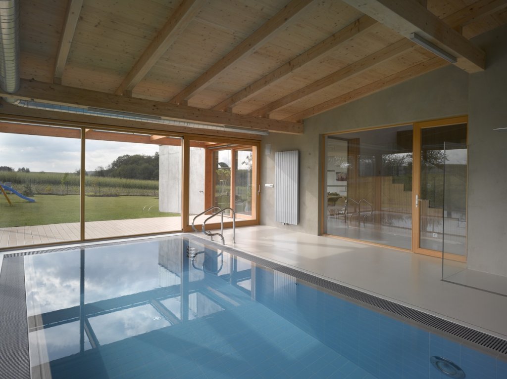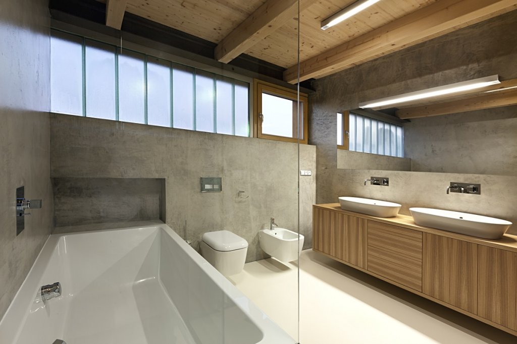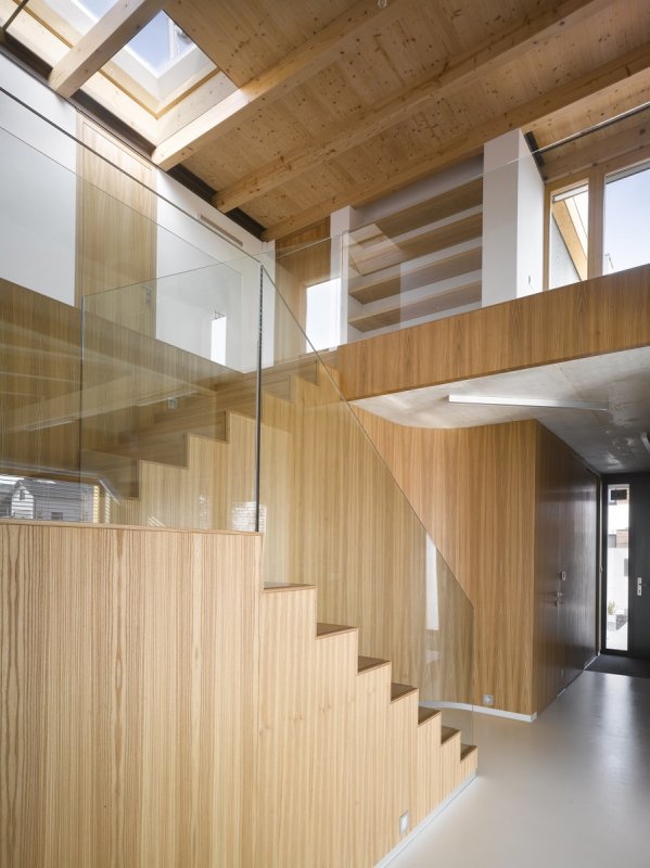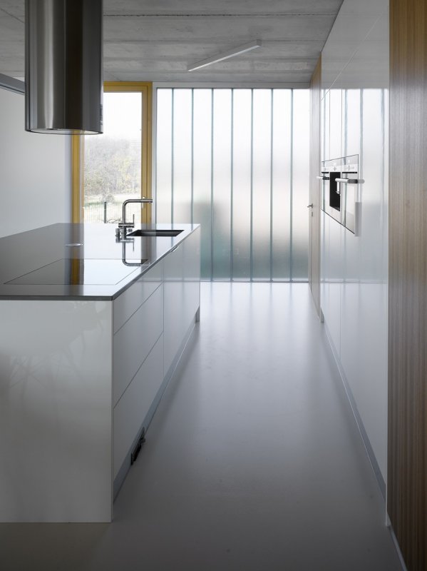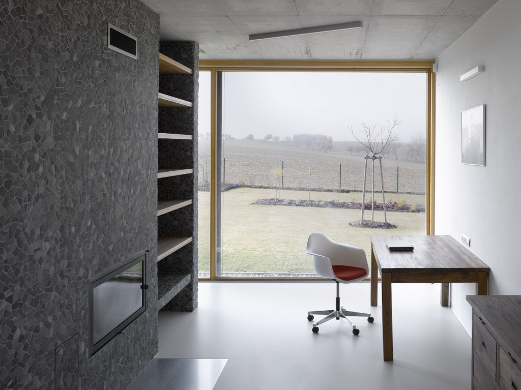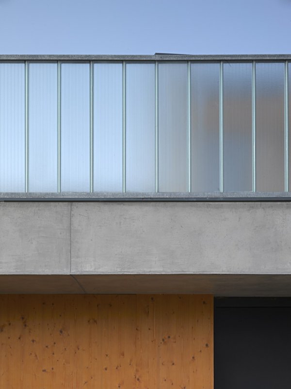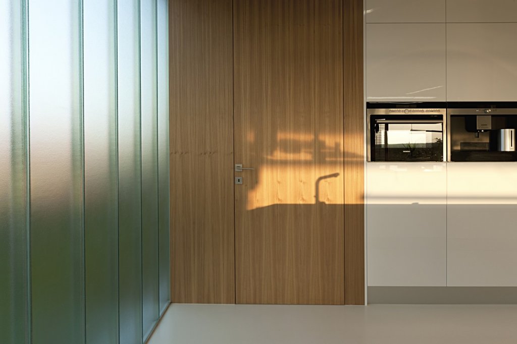 Posuvné prosklené výlohy propojují obytný prostor se zahradou. Lodžie v patře jsou sochařsky vykousnuté do betonové hmoty domu a jsou s bazénovou halou řešené ze dřeva, skla a šedého plechu. Zábradlí na terasách a část severní fasády je z copilitů. V kontrastu se zahradní otevřeností domu je z uliční strany dům pohledově uzavřený. Přiznané konstrukční prvky betonového stropu 1.NP a trámového krovu ploché střechy v 2.NP ukazují tektoniku domu, která je součástí architektury interiéru. Obklady stěn, schodiště, dveře a vestavný nábytek jsou z jasanové dýhy, krbová stěna je obložena kamennou mozaikou, v celém domě je litá průmyslová podlaha s podlahovým vytápěním.