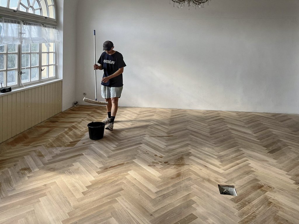 Následovalo broušení, tmelení, kartáčování a olejování nové dřevěné podlahy. Celý povrch byl nejprve důkladně přebroušen tříkotoučovou bruskou Lägler TRIO brusnou mřížkou o zrnitosti 40 a následně 60. Po důkladném odsátí vzniklého prachu byla celá podlaha tmelena spárovacím parketovým tmelem Pall-X Kitt. Poté došlo opět na přebroušení, tentokrát zrnitostí 80, přičemž šlo především o odstranění tmelu. Před kartáčováním byl celý povrch navlhčen – takzvaný „water popping“ (navlhčení povrchu dřeva tak, aby se pootevíraly póry a vyzdvihly letokruhy. Po následném kartáčování se měkčí částice dřeva odstraňují a struktura letokruhů zůstane výrazná). Ke kartáčování opět pomohla tříkotoučová bruska Lägler TRIO s ocelovými kartáči (na tvrdé dřevo), výsledkem pak byl výraznější reliéf, následně hlubší a bohatší tón po olejování.