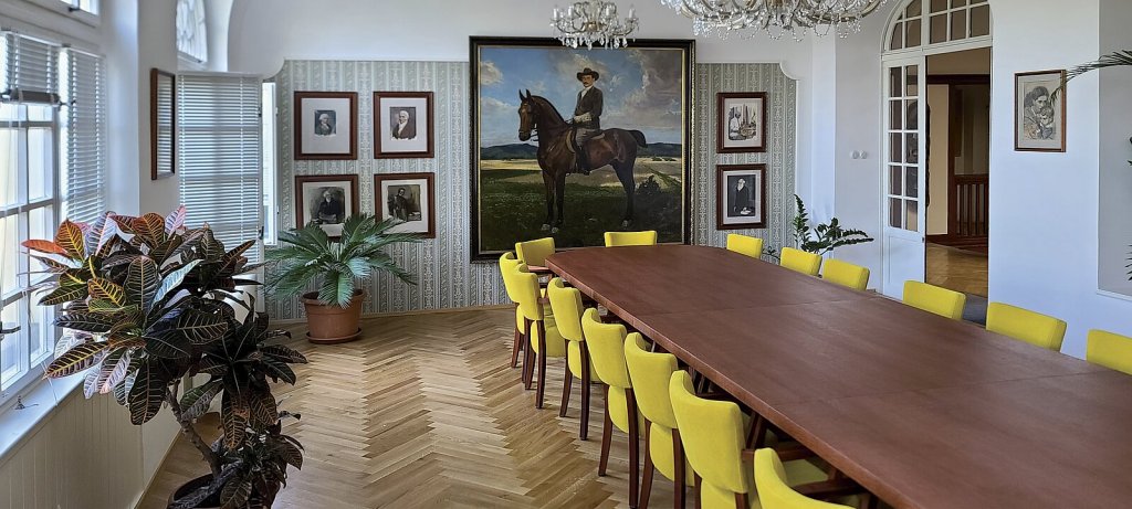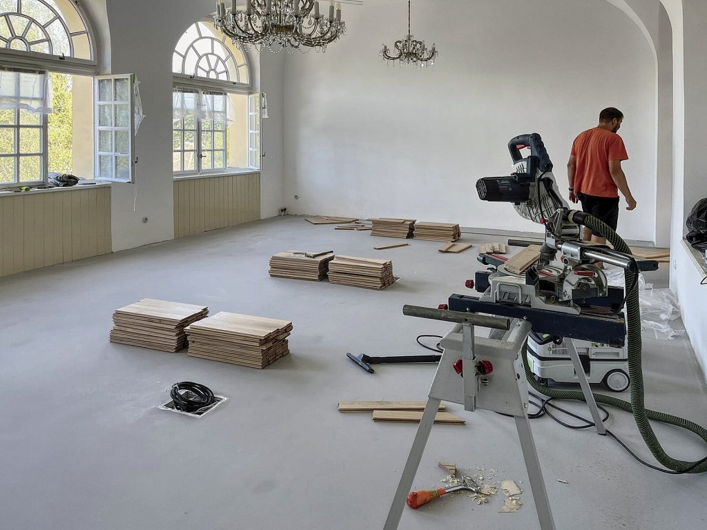 Na historickou roli vily jako reprezentativního sídla dnes navazuje i její současné využití: v prvním patře se nachází zasedací místnost, která slouží vedení Safari Parku i dalším pracovním setkáním. Právě tento prostor byl předmětem kompletní rekonstrukce podlahy, jejímž cílem bylo vrátit místnosti vzhled odpovídající původnímu charakteru vily. Nová skladba podlahy i povrchová úprava respektují historické řešení – jsou použity masivní dřevěné parkety, tak jak tomu bylo u původních podlah v reprezentativních místnostech domu. Následná část přibližuje konkrétní postup rekonstrukce, technická řešení i důraz na památkově citlivý přístup.