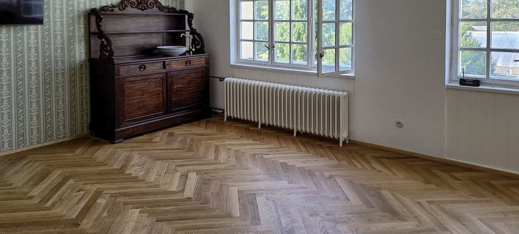 Jak již bylo zmíněno, v rámci rekonstrukce byl požadavek na obnovu historického rázu podlahy, takže za podlahovou krytinu byly zvoleny masivní dubové parkety 22 × 75 × 500 mm kladené „do stromečku“. Po nutné aklimatizaci dřeva v prostorách byla samotná práce rychlá a efektivní. Nejprve byly parkety přepraveny do prostoru a založena kontrolní řada, aby vše prostorově odpovídalo. Následně už mohla proběhnout samotná pokládka. K lepení masivních parket sloužilo prémiové parketové lepidlo UZIN MK 200. Tvrdě elastické lepidlo s dobrou stabilitou hřebínku a dlouhou otevřenou dobou. Z důvodů výškových rozdílů zasedací místnosti a chodby bylo potřeba vytvoření prahu.