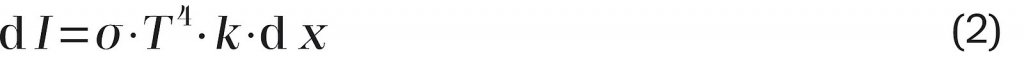 kde k je absorpční součinitel vzduchu. Tímto sdílením získává vrstva dx o ploše S, tedy o objemu Sdx, od vrstvy dy tepelný tok S·d2j. Na jednotku objemu, se kterou pracuje rovnice (3), to představuje tok S·d2j/Sdx = d2j/dx. Sálavý tepelný tok (přepočtený na jednotku objemu), který získává infinitezimální vrstva dx v důsledku sdílení tepla mezi ní a celou přilehlou makroskopickou vzduchovou vrstvou, která ji odděluje od okraje, je tedy dán integrálem: