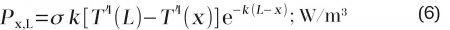 Podobně sálavý tepelný tok (přepočtený na jednotku objemu), který získává infinitezimální vrstva dx v důsledku sdílení tepla mezi ní a sálavým okrajem vrstvy v místě L, je