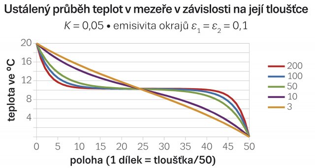 K tabulce ještě poznamenejme, že celkový ustálený tok tepla mezerou je stejný uprostřed i v blízkosti okrajů, mění se jen podíl sálání, který je uprostřed největší (na úkor vedení).