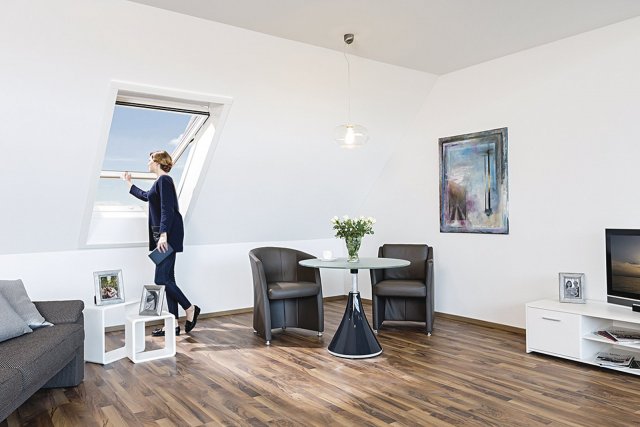 Způsob otevírání střešního okna je důležité vybrat právě podle výšky okna nad podlahou. Běžným typem okna je okno kyvné, u kterého se však musí počítat s tím, že křídlo bude zasahovat do interiéru. Dle výšky umístění okna může křídlo vadit ve výhledu i při samotném užívání místnosti. Firma Roto má v nabídce ještě další dva způsoby otevírání, které vám zpříjemní jak přístup k oknu, tak i výhled z něj. Prvním z nich je výsuvně-kyvné otevírání v horní čtvrtině rámu. Jedná se o dobrý kompromis, protože i při otevřeném okně je křídlo dostatečně vysoko nad podlahou a nezasahuje do interiéru. Druhým způsobem je otevírání výklopné/kyvné. Křídlo se otevírá v horním pantu. Zajišťuje tak absolutní volnost pohybu v prostoru okna i v jeho okolí a zároveň nabízí výborné funkční vlastnosti okna.
