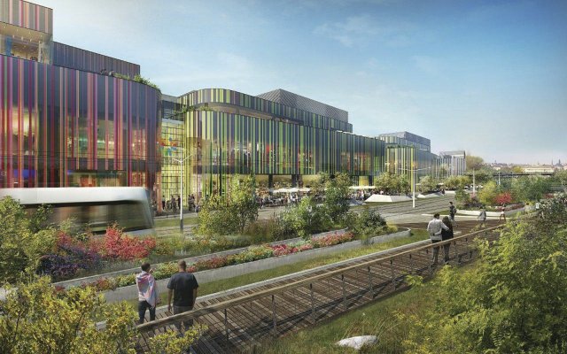 Dešťové srážky jsou odváděny za pomoci 181 ks kovových podtlakových střešních vtoků umístěných v různých skladbách střech, na které navazuje cca 3 150 metrů HDPE potrubí vedeného pod střešní konstrukcí, v podhledech, chodbách a instalačních šachtách. Dalších cca 1 100 metrů potrubí bude vedeno v suterénech v rámci navazujícího gravitačního systému. Systém samozřejmě doplňuje nespočetné množství tvarovek a systémových závěsných prvků, které zajišťují pevné uchycení potrubí a správné řešení dilatací a vodních rázů, které na potrubí mohou působit. Celkové množství dešťových vod svedených ze střech podtlakovým systémem bude při návrhové intenzitě srážky dosahovat hodnoty cca 723 litrů za sekundu.