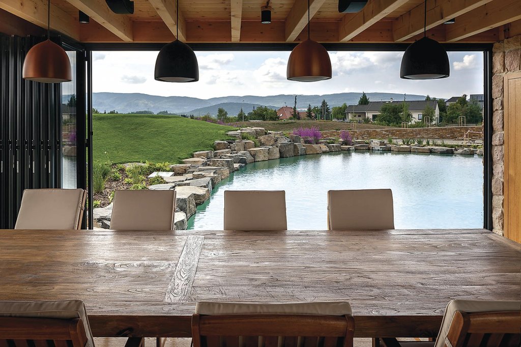 Celkovým vítězem a Domem roku 2021 se s nejvyšším počtem čtenářských hlasů stala velkorysá stavba architekta Petra Dobrovolného, která vévodila kategorii Domy se zastavěnou plochou nad 150 m2. Stavba má masivní a energeticky úspornou konstrukci, obvodové zdivo je z bloků Porotherm T Profi s větranou vzduchovou mezerou a kamennou přizdívkou. Oceněný projekt představuje jeho autor, architekt Petr Dobrovolný: „Zadáním byl komfortní dům pro čtyřčlennou rodinu, s krytým bazénem, velkoprostorovou garáží pro osm automobilů a s obytnou terasou včetně letní kuchyně pro grilování s přáteli. K hlavním požadavkům patřilo i maximální soukromí, hodně světla a krásné výhledy do krajiny. My jsme do zadání přidali vodní plochu a přejmenovali projekt na Dům na jezeře. Navrhli jsme řadu nejrůznějších variant, od přízemního až po čtyřpodlažní objekt, různé kombinace materiálů na fasádě i v interiéru. Postupně jsme dospěli k řešení, které je symbiózou přání investora a našich představ o souznění architektury a okolního prostředí.”