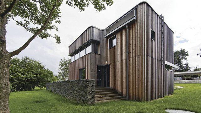 V kategorii Domů se zastavěnou plochou do 150 m2 získal 1. místo dům s netradičním půdorysem ve tvaru čtyřlístku, jehož autorem je Ing. arch. MgA. Michal Valert. Zadání tu bylo na první pohled poměrně konvenční – vytvořit praktické a moderní bydlení pro čtyřčlennou rodinu, a to s maximálním možným propojením domu se zahradou. Určující bylo přání investora, aby dům disponoval dřevěnou fasádou a zaoblenými rohy. To pak dalo vzniknout originálnímu řešení, jímž je větraná fasáda z neupraveného modřínu, se zaoblenými rohy obvodového pláště, které jsou u dřevěných fasád poměrně neobvyklé. „Dům má ve skutečnosti řádný pravoúhlý základ z cihelného zdiva Porotherm, tvoří jej čtverec s vyjmutými rohy, a díky zaoblení fasády připomíná čtyřlístek,” odhaluje tajemství tvaru architekt Michal Valert, autor návrhu.
