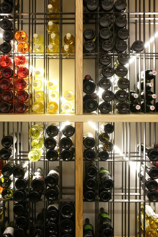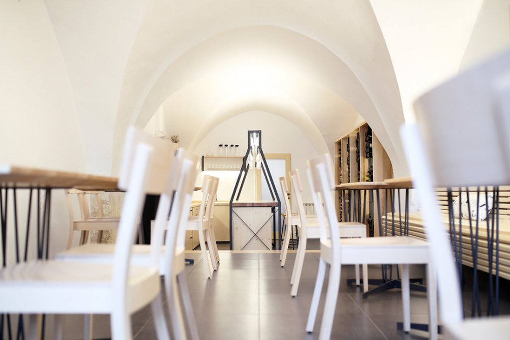 Před naším návrhem bylo již jasno ve jméně winebaru „Chatka” (spojení prvních slabik příjmení investorů) a bylo vytvořeno logo – domeček jedním tahem s křížem uprostřed. Dvojice kleneb přirozeně člení prostor na dvě části. Té u vchodu, kde je posezení pro hosty, vévodí lustr ve tvaru kříže a dlouhá lavice. Druhé části dominuje objekt pracovního stolu/baru a fortelný regál na víno. Do kleneb nezasahujeme, pouze je nasvětlujeme. Autenticitu a jedinečnost tomuto prostoru dodává jasanové dřevo, umná práce truhláře a zámečníka a návrh stolů, svítidel i lavice speciálně pro tento prostor. Není zde nic navíc. Osvětlení je řešeno LED pásky, což umožňuje maximální subtilnost zavěšeného lustru i nenápadné integrování osvětlení do kusů nábytku. Skleničky se stávají stínítkem, prosvětlené láhve s vínem vytvářejí jemné zabarvení celého prostoru baru.