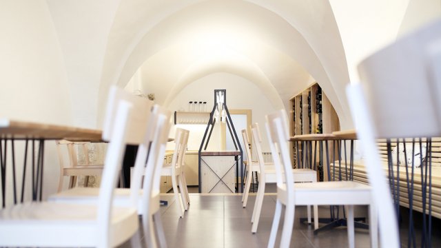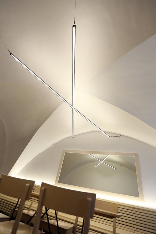 Na začátku byl prázdný prostor pod dvojicí křížových kleneb. Křížení jsme použili jako základní motiv, který prostupuje celým interiérem.